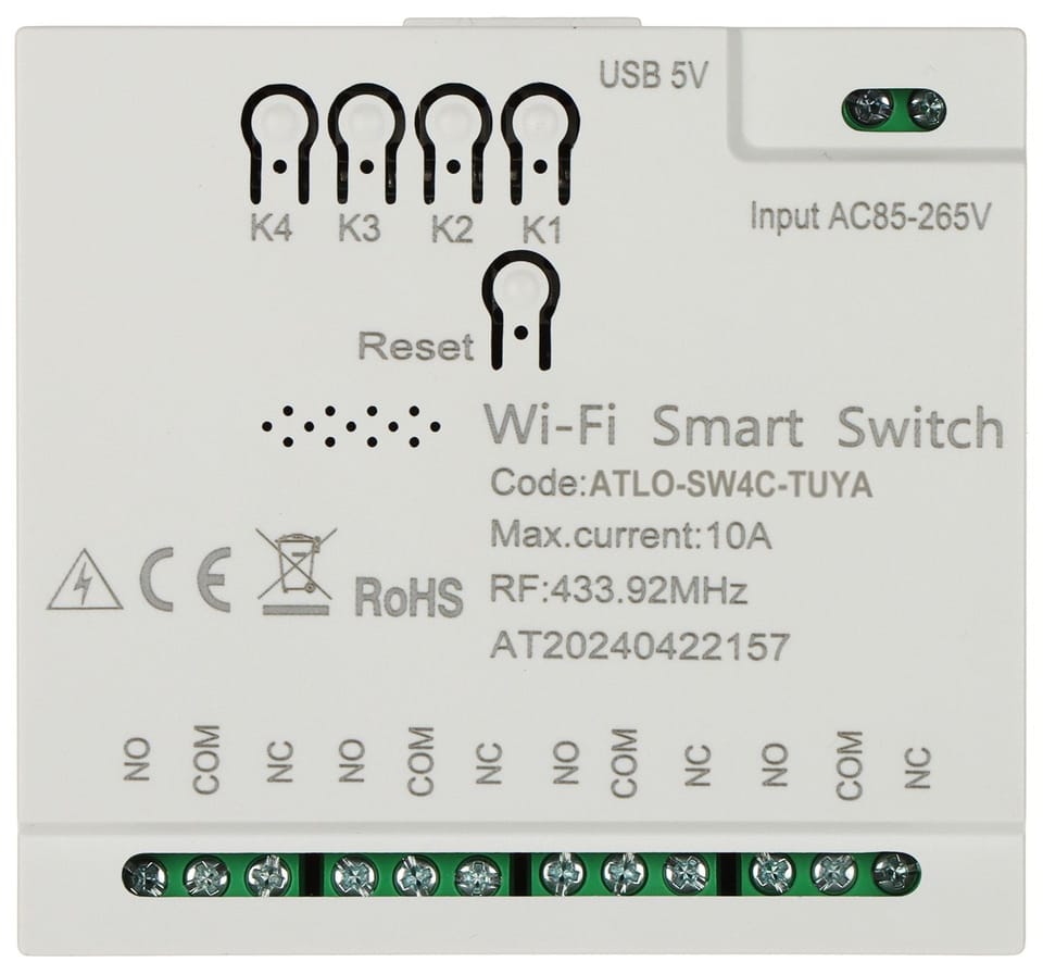 Inteligentny przełącznik elektryczny Wi-Fi ATLO-SW4C-TUYA pozwala sterować podłączonymi do niego urządzeniami za pomocą aplikacji mobilnejDo prawidłowego funkcjonowania urządzenia niezbędne jest połączenie go z siecią Wi-Fi z dostępem do Internetu
