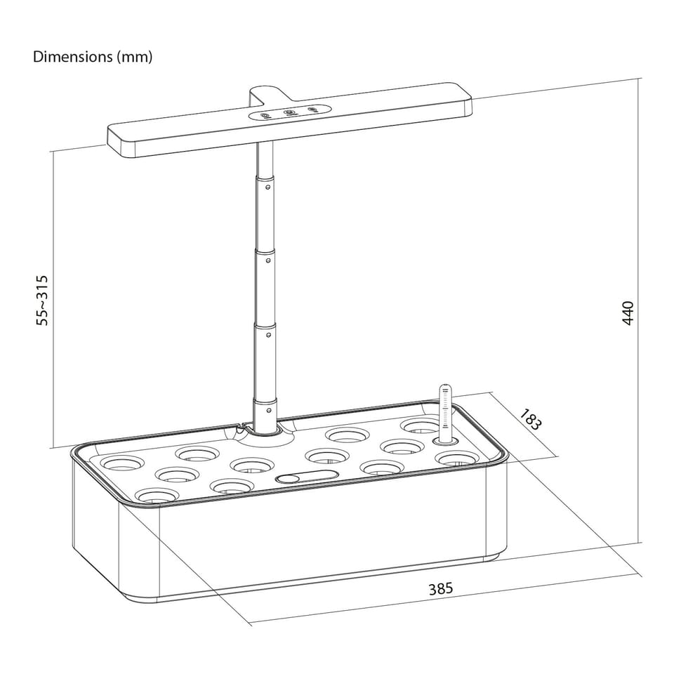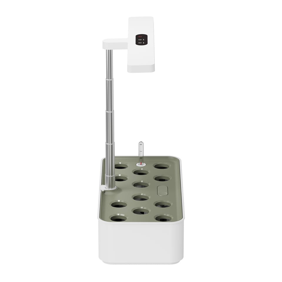 Cechy- Inteligentny system uprawy roślin w domu- Możliwość uprawy aż 12 roślin jednocześnie w jednym urządzeniu- Zbiornik na wodę o pojemności 4 litrów zapewniający długą pracę bez konieczności uzupełniania- Nowoczesne diody LED full spectrum wspierające fotosyntezę i szybki rozwój roślin- Automatyczne tryby oświetlenia dostosowane do warzyw lub kwiatów- Regulowana wysokość lampy w zakresie od 55 mm do 315 mm – idealna dla różnych gatunków roślin- Dotykowy panel sterowania ułatwiający obsługę i zmianę ustawień- Wskaźnik poziomu wody przypominający o konieczności uzupełnienia zbiornika- Cicha pompa działająca cyklicznie, zapewniająca napowietrzenie i cyrkulację wody- Szybszy wzrost roślin – nawet 3 do 5 razy w porównaniu z tradycyjną uprawą w ziemi- Idealny do uprawy ziół, warzyw, owoców i kwiatów przez cały rok