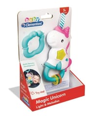 Magiczny jednorożec, który zabawia dziecko światłem i muzyką!Posiada lśniący przycisk w kształcie gwiazdki oraz kolorowe zawieszki, które wydają z siebie zabawne dźwięki.Posiada praktyczną obręcz, dzięki której grzechotkę można przymocować do kołyski lub wózka bądź też nosić przy sobie.