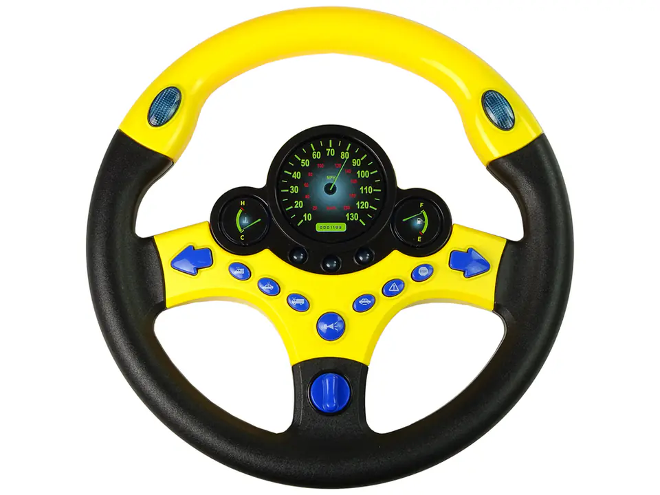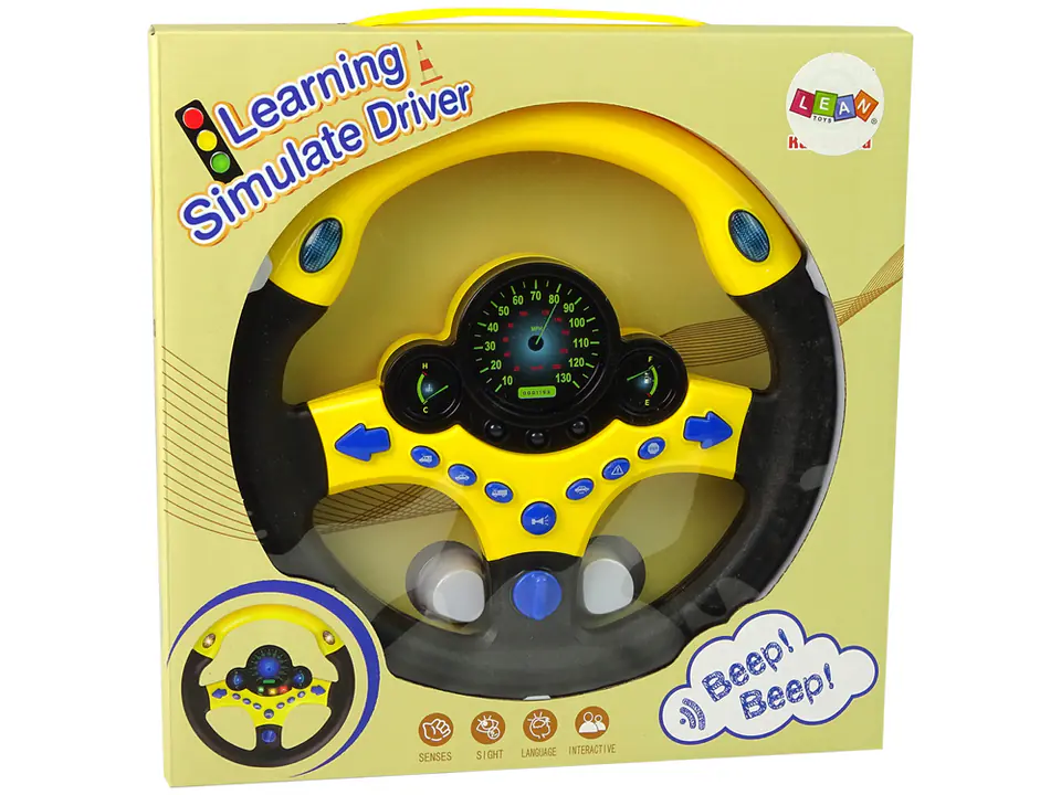 Interaktywna kierownica to niesamowity prezent dla każdego dziecka, które chce się sprawdzić w roli kierowcy. Zabawka sprawia mnóstwo frajdy, ale także wpływa pozytywnie na rozwój malucha.Kierownica jest w kolorystyce żółto- czarnej. Cała kierownica ma 9 przycisków w tym dwa kierunkowskazy, klakson oraz sygnały służb ratunkowych. Wystarczy, że przekręci kluczyk startu i może rozpocząć zabawę ! Zegary na kierownicy podświetlają się na niebiesko. Wygląd oraz diody sprawią, że maluch poczuje się jak na prawdziwej ulicy, prowadząc swoje autko. Kierownica pasuje idealnie do rączki malucha. Czas na symulacje jazdy w wykonaniu Twojego dziecka.Naciskając kolejno przyciski, bardzo łatwo dziecko nauczy się podstawowych zasad ruchu drogowego. Każdy przycisk to inna funkcja, po naciśnięciu jednego z nich usłyszymy słowa po angielsku tłumaczące po kolei znaczenie.