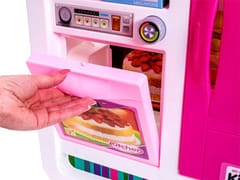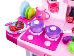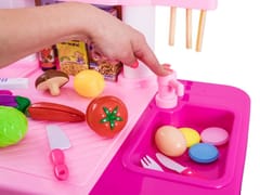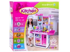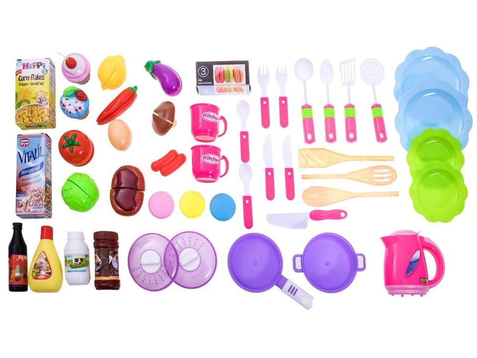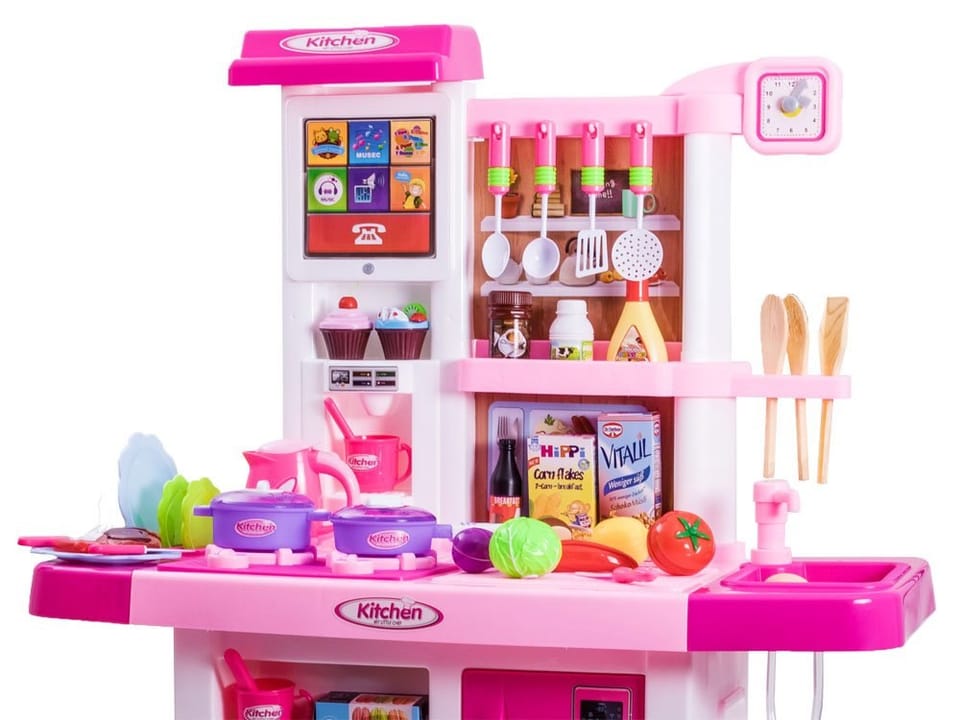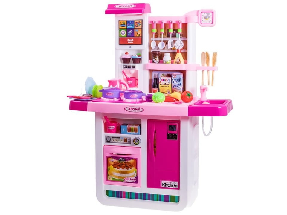 Kuchnia jest bardzo dobrze wyposażona:- 2 palniki z dźwiękami i światłami- lodówka - piekarnik - zlew z kranem, z którego leci woda- wbudowana w blat deska do krojenia- suszarka na naczynia- półeczki na przyprawy- wieszaki na akcesoria kuchenne- okap- ekspres do kawy- zegarWyposażenie:- 7 x warzywa na rzepy- garnek z pokrywką- patelnia z pokrywką- 4 talerze- 2 filiżanki- czajnik z otwieranym wieczkiem- przybory kuchenne : łyżki, szpatułka, chochla, sztućce- imitacja jedzenia: płatki, sosy, parówki, jajko, mleko, kawa, sos, ciasteczka itp.