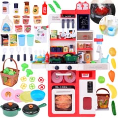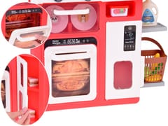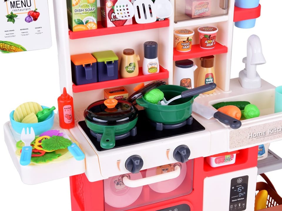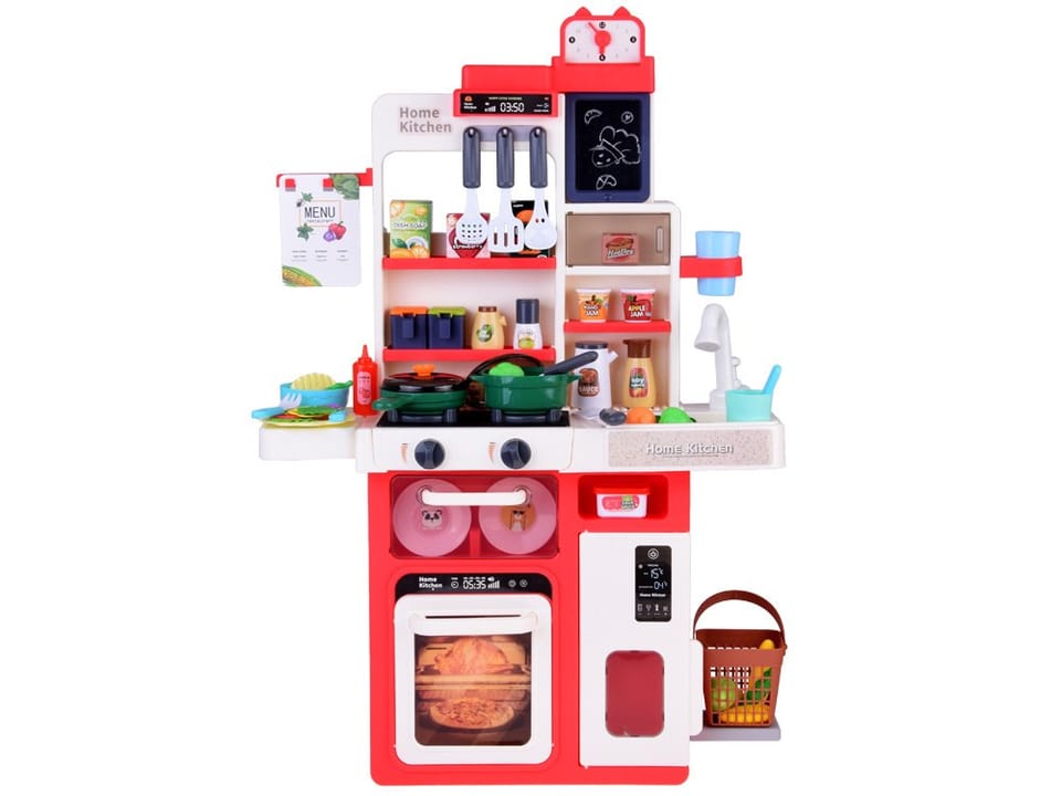 FUNKCJE KUCHNI:- Palniki: kuchenka posiada dwa podświetlane palniki, które po przekręceniu, świecą się na czerwono i wydają odgłosy gotowania, jak prawdziwy, domowy sprzęt. Dodatkowo można wlać do nich wodę, dzięki której wytworzy się prawdziwa para wodna. - Kran: po nalaniu wody do kranu, należy naciskać pompkę, znajdującą się opok kranu. Dzięki temu kran zassie wodę, aby następnie wylać ją przez właściwy otwór. W ten sposób dziecko będzie mogło korzystać z "bieżącej wody", oczywiście z jej ograniczoną ilością.- Otwierane elementy: szafka, lodówka, zmywarka oraz piekarnik - w które, bez problemu, zmieści się mnóstwo kuchennych elementów.- Tablica: na której dziecko może rysować/pisać np. przepisy, dołączoną do zestawu zmazywalną kredą. - Zegar: na samej górze kuchni znajduje się zegar z ruchomymi wskazówkami.- Zróżnicowane wyposażenie: kuchnia posiada w sumie 66 elementów, co czyni ją bardzo atrakcyjną w oczach dziecka.