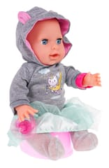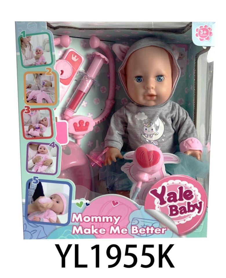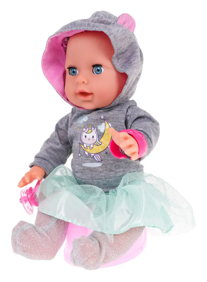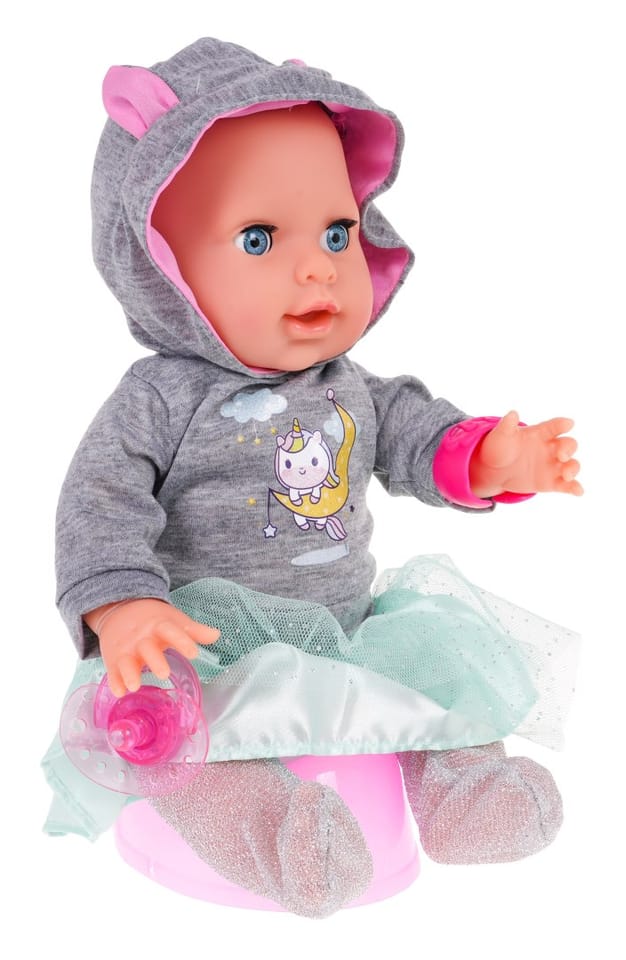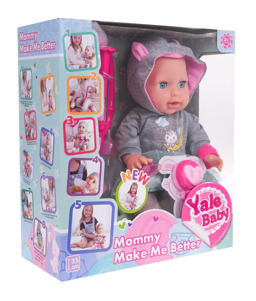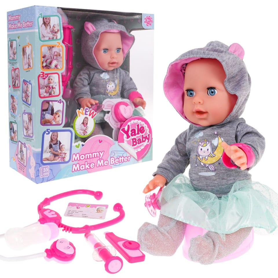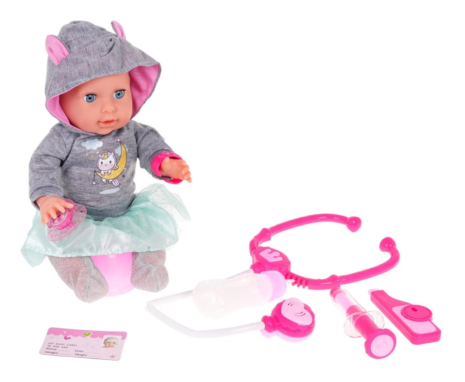 Niesamowita interaktywna lalka dla dzieci od 3-go roku życia. Laleczka płacze, zamyka i otwiera oczka, pije wodę, sika, rusza rączkami i nóżkami, śmieje się, a nawet gorączkuje, kicha i kaszle. Do zestawu dołączono wiele akcesoriów a wśród nich magnetyczny smoczek i akcesoria lekarza. Dzięki tej lalce twoja pociecha nauczy się odpowiedzialności i troski o innych. „Chorej" lalce można zrobić zastrzyk, zmierzyć temperaturę, osłuchać stetoskopem. Zabawka zasilana jest bateriami typu 3 x AA 1,5 V, baterii brak w zestawie. Stetoskop zasilany jest bateriami 2 x AG13, baterie znajdują się w zestawie. Funkcje lalki: - posiada efekty dźwiękowe w postaci płaczu, śmiechu, kichania, kaszlu, bulgotania, chrapania, - zamyka i otwiera oczka, - rusza rączkami i nóżkami (manualnie), - pije wodę, - robi siku do nocniczka, - „gorączkuje" - podświetlają jej się policzki, - posiada magnetyczny smoczek który „uspokaja" lalkę, - posiada wiele akcesoriów.