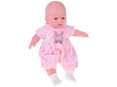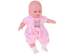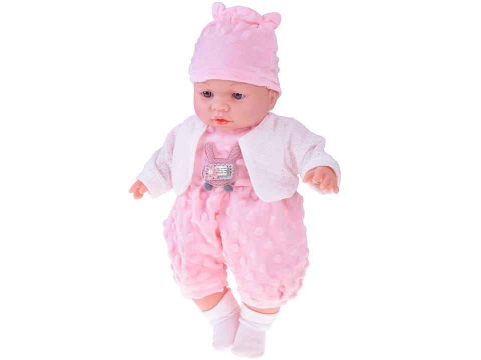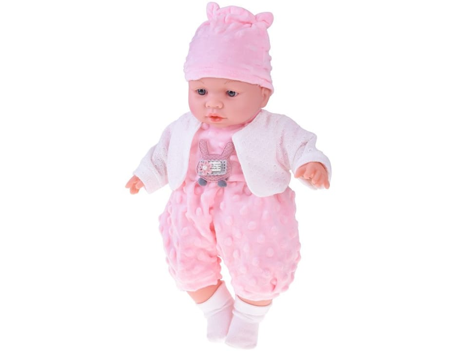 - lalka ubrana jest w różowy rampers z materiału minki z ozdobnym elementem, czapeczkę z uroczymi uszkami, biały kardigan oraz skarpetki