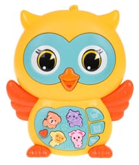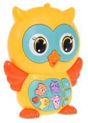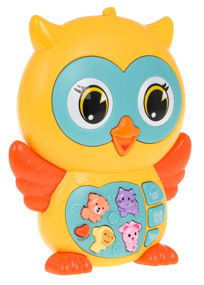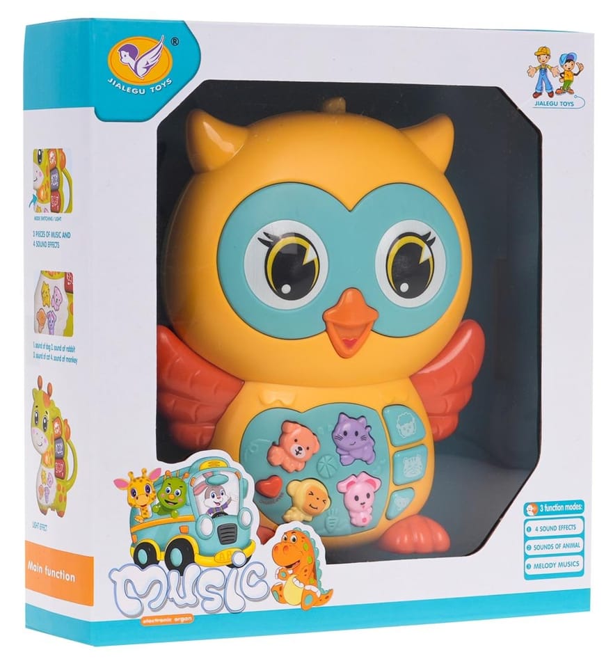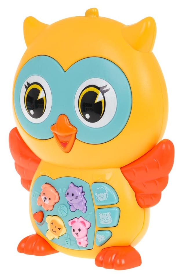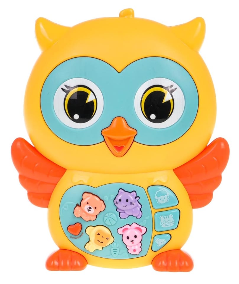 Interaktywna sowa z funkcją dźwięku i światła dla dzieci od 6-go miesiąca życia. Sowa wykonana została z najlepszej jakości plastiku, jest odporna na uderzenia i bezpieczna dla maluszków, nie posiada, żadnych ostrych krawędzi. Sowę wykonano w żywych kolorach, przyciągających wzrok dziecka i zachęcających do zabawy. Na brzuszku sowy znajduje się panelik z przyciskami uruchamiającymi odgłosy zwierząt (w pierwszym trybie), melodie, dźwięki Do-Re-Mi (w drugim trybie) oraz efekty świetlne w postaci migoczących światełek na skrzydełkach sowy. Tryby zmieniamy przyciskiem w kształcie serduszka. Zabawka posiada regulację głośności. Zasilana jest bateriami typu 2 x AA 1,5 V (brak w zestawie) Funkcje zabawki: - przeznaczona dla dzieci od 6-go miesiąca życia, - wykonana z najlepszej jakości plastiku w żywych kolorach, - bezpieczna, nie posiada ostrych krawędzi, - odporna na upadki, - efekty świetlne: podświetlane skrzydła sowy, - efekty dźwiękowe: * tryb z odgłosami zwierzątek: pieska, kotka, małpki, owieczki, tygrysa, słonia, * tryb z dźwiękami: melodie, dźwięki Do-Re-Mi.