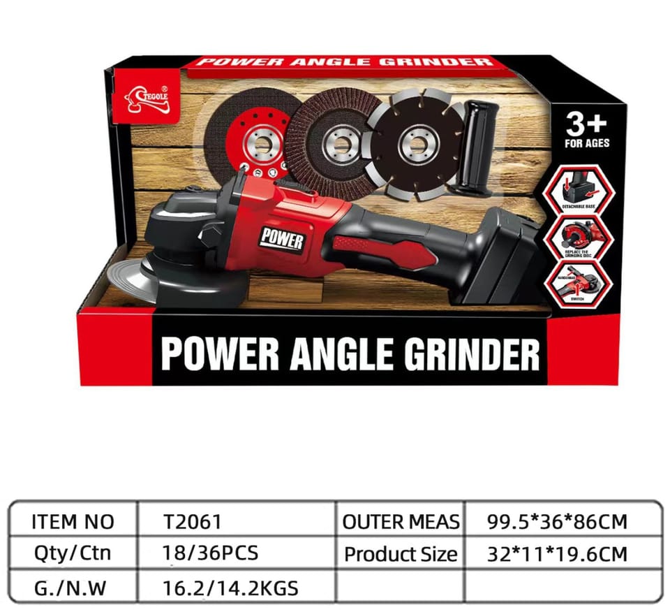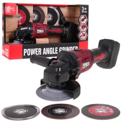 Szlifierka akumulatorowa dla dzieci od trzeciego roku życia. Szlifierka do złudzenia przypomina prawdziwą, a wszystkie jej funkcje są w pełni bezpieczne dla dziecka. Kiedy dziecko dotknie rączką tarczy, wówczas tarcza przestaje się obracać. W zestawie znajdują się również trzy wymienne rysunki tarczy, różnie zakończone. Po przesunięciu czarnego przycisku znajdującego się na górnej części zabawki, szlifierka zaczyna obracać tarczą i wydawać odgłosy szlifowania. Szlifierka posiada wyjmowany akumulator oraz rączkę, którą możemy zakładać po prawej bądź lewej stronie. Zabawka zasilana jest bateriami typu 2 x AA 1,5V. Baterii brak w zestawie.