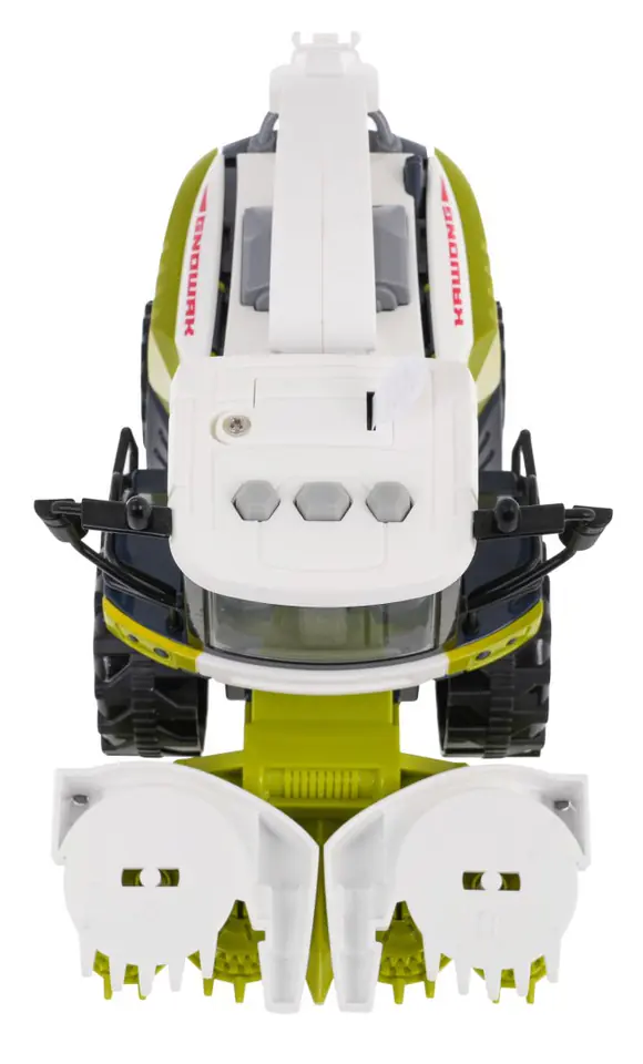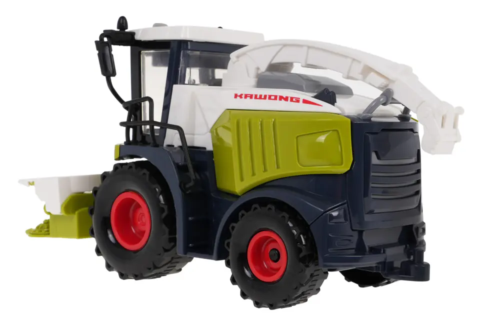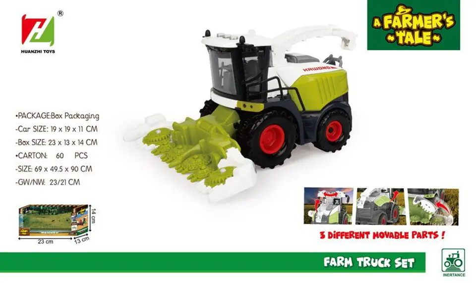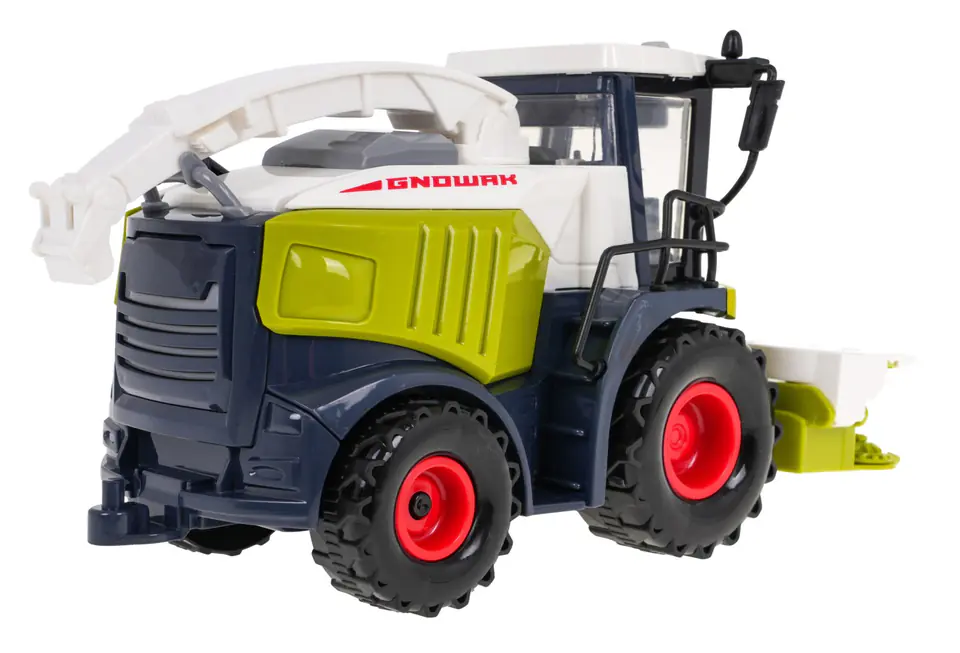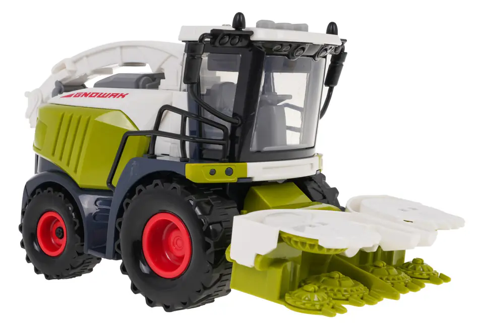 Interaktywny kombajn z funkcją dźwięku i światła oraz ruchomymi elementami to propozycja dla małych miłośników rolnictwa od 3-go roku życia. Kombajn wykonano w kolorach charakterystycznych dla tego rodzaju maszyn, oraz wyposażono w nagarniacz, oraz podajnik zboża. Maszyna ma obrotowe koła z bieżnikiem oraz „oszkloną" kabinę. Kombajn wydaje dźwięki pracy silnika, klaksonu oraz sygnały ostrzegawcze, na dachu znajduje się panel dźwiękowy z przyciskami. Dźwiękom towarzyszą mrugające światełka LED na górze kabiny. Kombajn gładko przemieszcza się po podłożu dzięki napędowi frykcyjnemu. Zabawka zasilana jest bateriami typu 3 x 1,5V AG13, baterie znajdują się w zestawie. Specyfikacja: - kombajn jeździ do przodu i tyłu, - duże koła z napędem frykcyjnym na przód, - funkcje dźwiękowe: praca silnika, klakson, sygnały ostrzegawcze, - świetlne: działające przednie światła LED, - podnoszony i opuszczany nagarniacz (ręcznie), - składane boki nagarniacza (ręcznie), - obrotowe koła na nagarniaczu (ręcznie), - podnoszone i opuszczane boczne klapy nad tylnymi kołami (ręcznie), - podnoszony oraz obrotowy o 360 stopni podajnik zboża (ręcznie), - podnoszony i opuszczany zsyp do zboża na podajniku (ręcznie), - hak na tyle kombajnu.