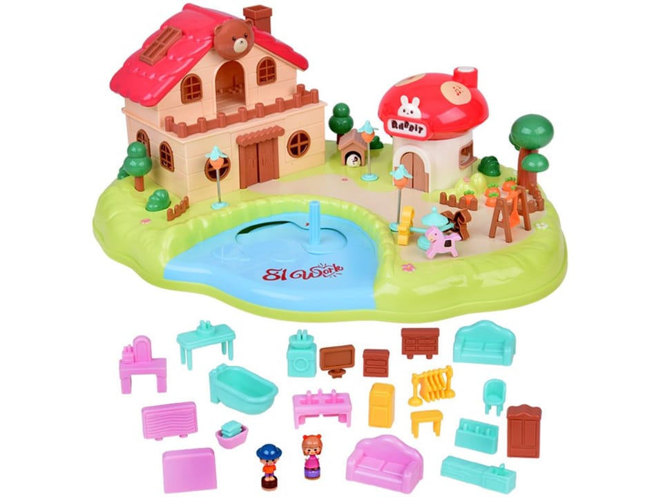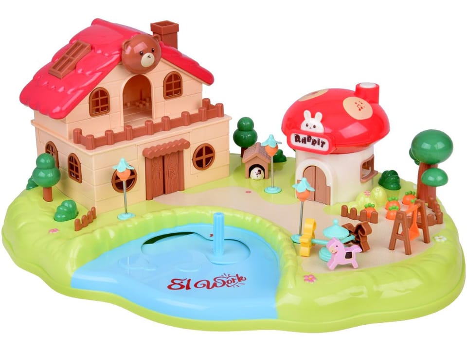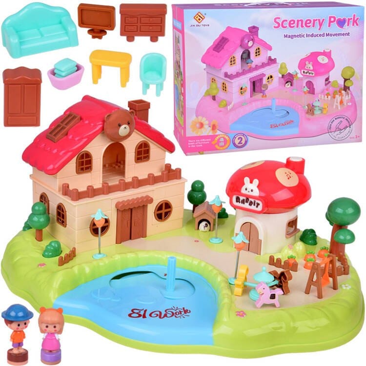 Magnetyczny Domek z Ruchomymi Elementami - "Scenery Park" to zabawka edukacyjna oparta na ruchu wywołanym indukcją magnetyczną. Zestaw przedstawia kolorową scenerię z uroczym, otwieranym domkiem, sklepikiem w kształcie grzyba oraz placem zabaw otoczonym drzewami, grządką z marchewką i innymi uroczymi szczegółami. Zabawka wyposażona została także w efekty dźwiękowe i świetlne, które zapewne urozmaicą zabawę.Jak to działa?Po wyjęciu z opakowania, należy porozstawiać mebelki, ludziki, usunąć blokadę z baterii z domku muchomorka i można zacząć zabawę.Zadaniem dziecka jest przesuwanie za pomocą drążka sterującego znajdującego się na tafli niebieskiego stawu, ludzików tak aby mogli uprawiać marchewką na swojej grządce, pójść na plac zabaw pobawić się na karuzeli, huśtawce, odwiedzić swojego pieska. W dwupoziomowym mieszkaniu na parterze znajduje się pokój z wygodnym łóżkiem, wystarczy podnieść pościel, aby ludzik mógł się położyć, szafa, która się otwiera jak figurka ludzika do niej podejdzie. Oprócz tego jak to w salonie jest ława, szafka nocna, telewizor, sofa, komoda.Na piętrze jest łazienka z wanną, umywalki, pralnia.Na drugim piętrze lokatorzy znajdą kuchnię z lodówką, zlewozmywak, kredens. Obok znajduje się pokój z toaletką, szafa na garderobę.Domek muchomorek działa jako sklepik. Można wejść do niego do środka i sprzedawać. Wyposażony jest w ladę, kasę oraz półki. Indukcyjny dach domku posiada przyciski odpowiedzialne za efekty dźwiękowe. Na kominie domku znajduje się główny przycisk, uruchomiający dźwięk, oraz dwa przyciski indukcyjne odpowiedzialne za zmianę dźwięków. Całość wizualną uzupełnia neon z napisem Rabbit, który jest podświetlany w rytm dźwięków.