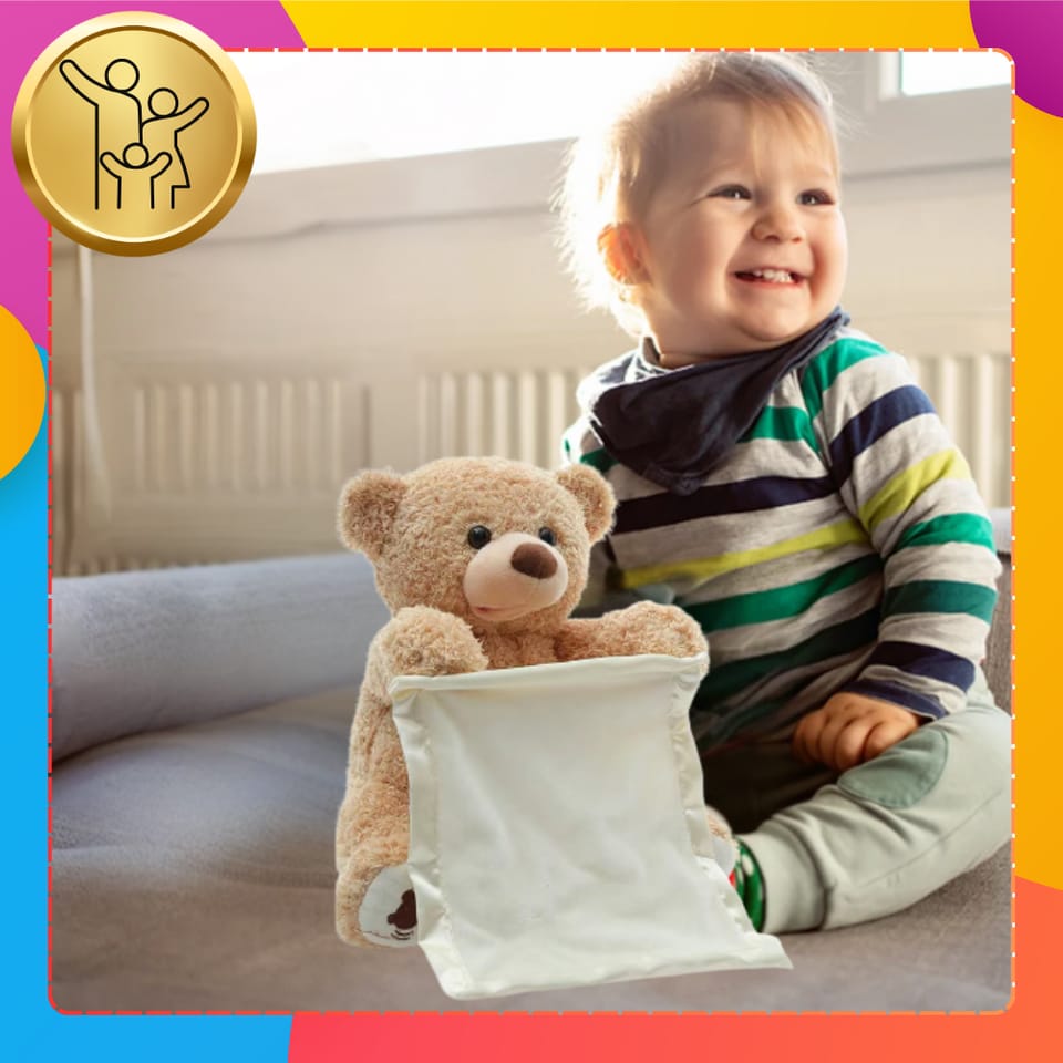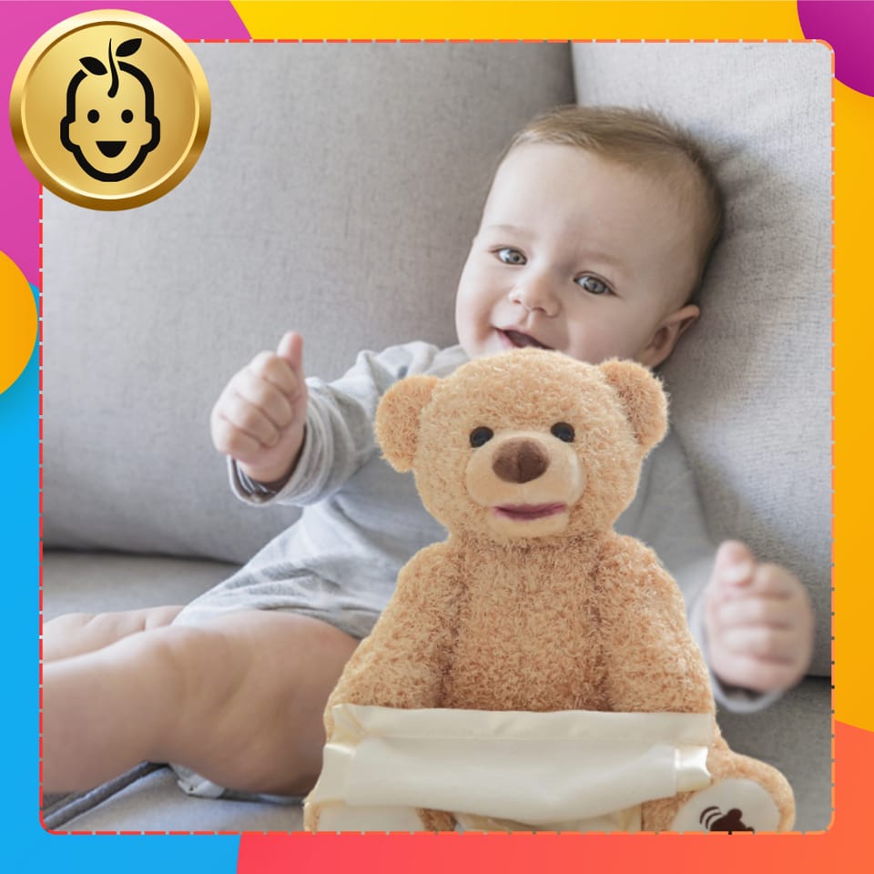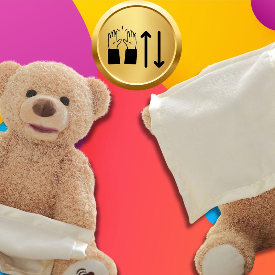 Po naciśnięciu przycisku na stopie misia, powoduje ucuchomienie go i zaczyna zabawę w chowanego:) Oraz zaczyna mówić po angielsku. "Where are you?" :) "Peek-A-Boo, I see you!"