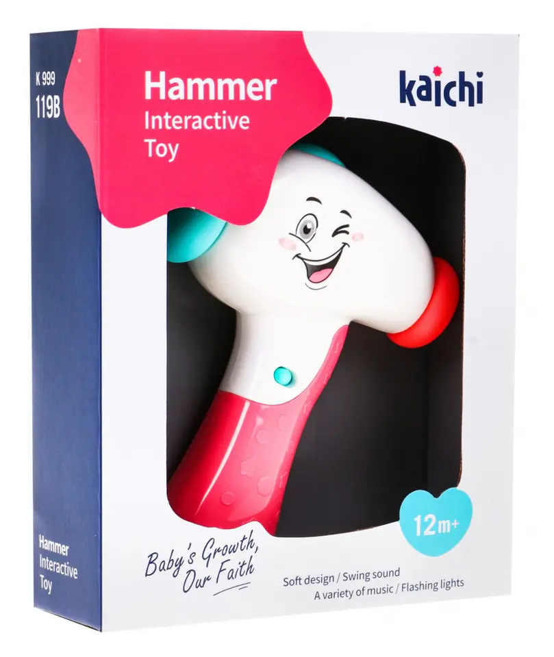 Kolorowy interaktywny młotek to zabawka przeznaczona dla dzieci od 12 miesiąca życia. Młotek ma zabawny wygląd, posiada efekty świetlne i dźwiękowe. Po każdym uderzeniu uruchamiają się melodyjki i różne odgłosy, mruga też światełko na górze zabawki. Zabawka zasilana jest bateriami typu 2 x AA które znajdują się w zestawie. Używanie tego młotka przez Twojego maluszka pozytywnie wpłynie na jego rozwój sensoryczny, wspomoże umiejętność motoryczne, zdolności poznawcze i koordynację wzrokowo-ruchową. Funkcje zabawki: - dźwiękowe, - świetlne, - poznawcze-kształcące.