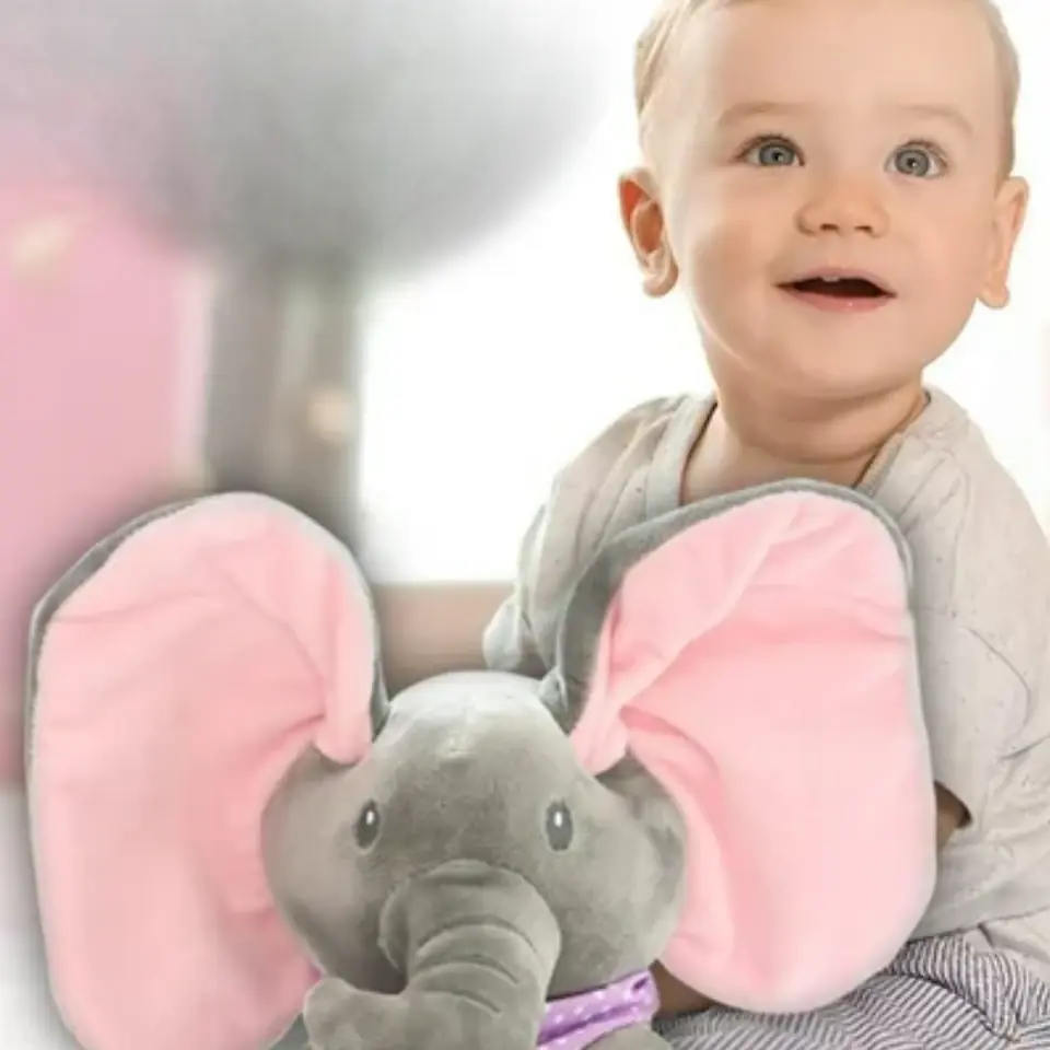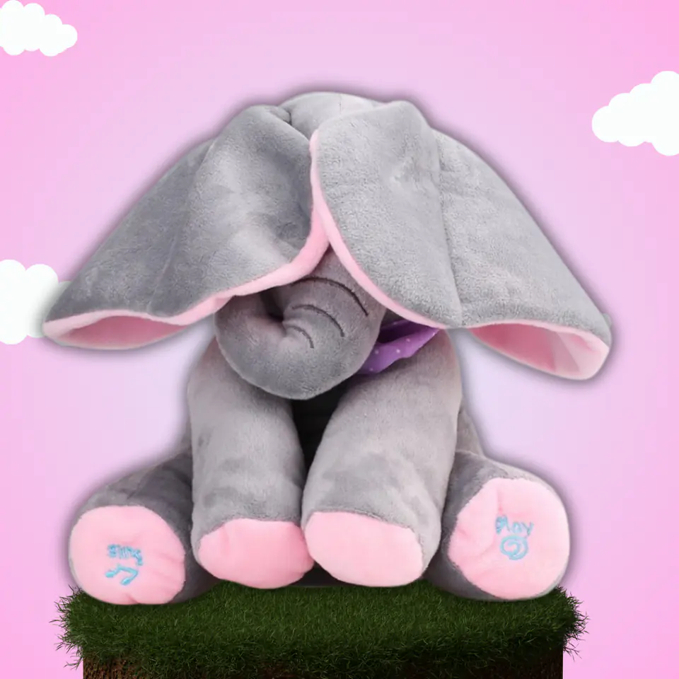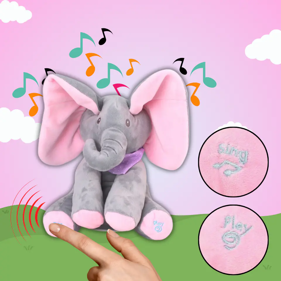 - Po naciśnięciu przycisku PLAY słonik rozmawia i bawi się w chowanego z Twoim dzieckiem zakrywając oczka uszami. Dźwięk i ruch przyciągają uwagę dziecka.
