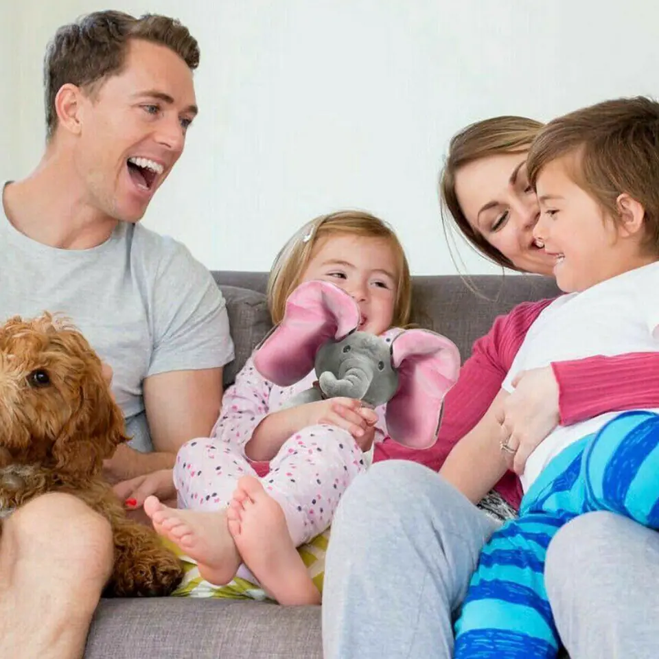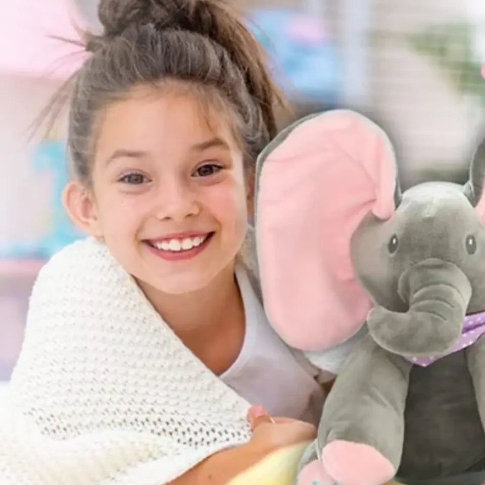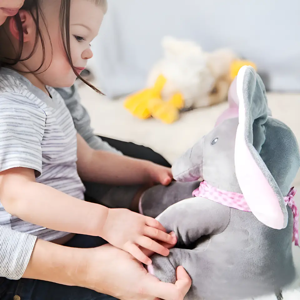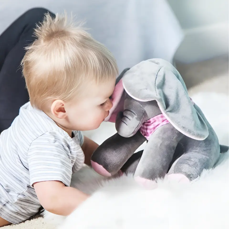 - Po naciśnięciu przycisku PLAY słonik rozmawia i bawi się w chowanego z Twoim dzieckiem zakrywając oczka uszami. Dźwięk i ruch przyciągają uwagę dziecka.