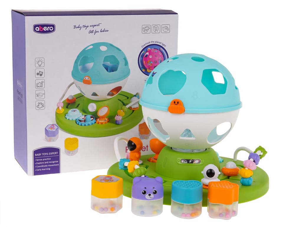 | Interaktywny, edukacyjny, sorter o tematyce kosmosu dla maluszków od 18-go miesiąca życia. Sorter wykonany został z najlepszej jakości plastiku w żywych kolorach, przyciągających wzrok maluszka. Zabawka składa się z podstawki, na której znajdują się kółeczka zębate do kręcenia, labirynty do pokonania i przekładanki. Na podstawce jest również okrągły sorter z otworami w kształcie figur geometrycznych. Maluszek musi przypasować klocuszki znajdujące się w zestawie do odpowiednich kształtów na sorterze. Po dopasowaniu wszystkich klocków sorter można otworzyć i zabawę rozpocząć na nowo. W zestawie znajdują się 4 klocuszki. Dodatkowo każdy z nich w środku posiada małe kuleczki, które sprawiają, że klocuszek grzechocze. Sorter posiada również funkcję światła i dźwięku, z wnętrza kuli wydobywa się gwiezdny blask i słychać melodie. Zabawa tym sorterem uczy maluszka dopasowywać i kategoryzować według kształtu i koloru. Poprawia zdolności poznawcze i motoryczne. Dziecko poznaje przyczynę i skutek oraz doskonali umiejętności rozwiązywania problemu. Zabawka zasilana jest bateriami typu 3 x AA 1,5 V (brak w zestawie). Funkcje zestawu:- odpowiedni dla maluszka od 18-go miesiąca życia,- wykonany z najlepszej jakości plastiku w żywych kolorach,- daje mnóstwo możliwości zabawy: sorter kształtów i kolorów, koła zębate do kręcenia, labirynty, przekładanki,- funkcje dźwiękowe: melodie, grzechoczące klocki,- funkcje świetlne: projektor,- klocuszki z kuleczkami w środku, | |