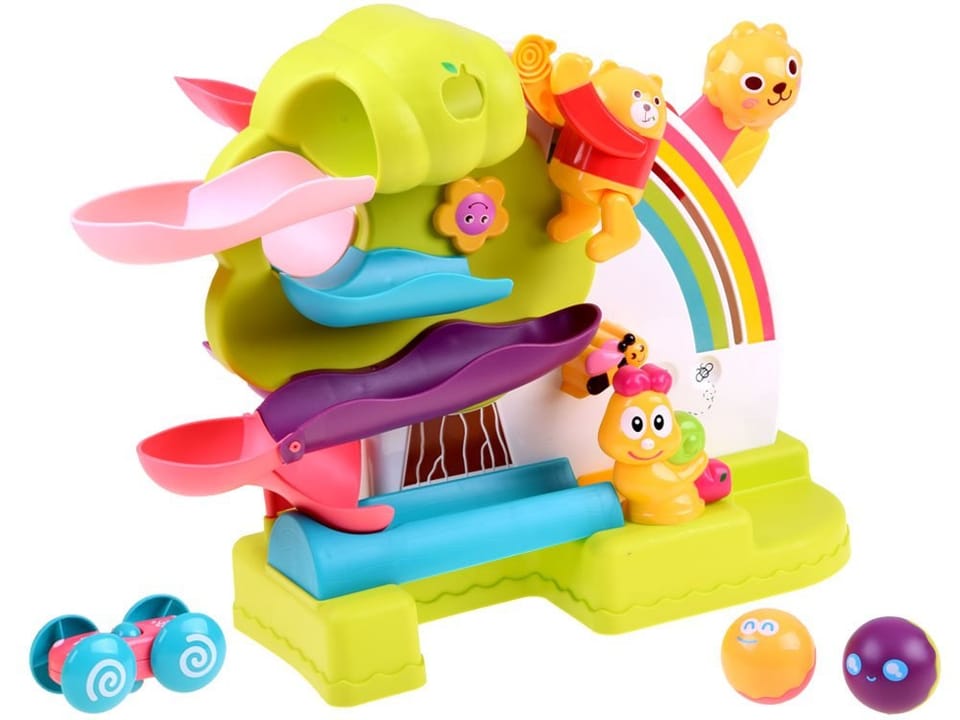 Zestaw składa się z:- dwustronnego toru- dla autka i kulek,- 2 kulek- autka.Wymiary zabawki: ok. 31 cm x 21 cm x 31 cmAutko: ok. 8 cm x 4 cm x 4cm Średnica kulek: ok. 4,5cm Zabawka wykonana jest z wysokiej jakości materiałów w przyjemnych dla oka kolorach. Dziecko na pewnym etapie rozwoju uwielbia obserwować spadające, poruszające się elementy a z czasem wprawiać je samemu w ruch. Zabawka stymuluje rozwój zmysłu wzroku, spostrzegawczość, koordynację ruchową maluszka.Żywa kolorystyka i ciekawy kształt toru zapewnią wiele godzin niesamowitej zabawy.