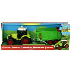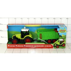 Zestaw został wykonany z wysokiej jakości tworzywa w naturalnej kolorystyce dzięki czemu wygląda jak prawdziwy pojazd rolniczy. Przyczepa jest odpinana więc możemy przewieźć na niej ładunek i odpiąć ją, by traktor móc odstawić do stodoły. Ciągnik posiada ruchomą przyczepę, inaczej rozrzutnik obornika, dzięki której można coś wysypać lub rozrzucić po polu określony nawóz.