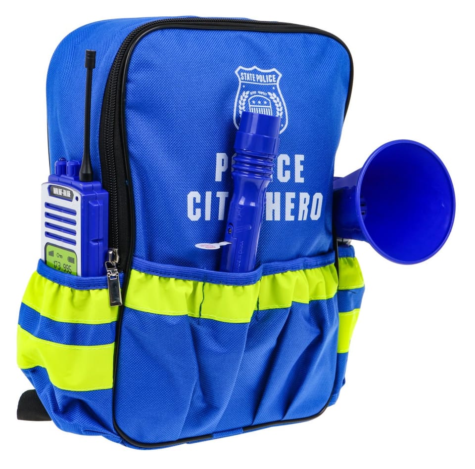 | - plecak,- kajdanki,- pistolet,- identyfikator z odznaką,- gwizdek ze sznureczkiem,- krótkofalówka – łoki toki,- megafon,- latarka,- klucze do kajdanek, |