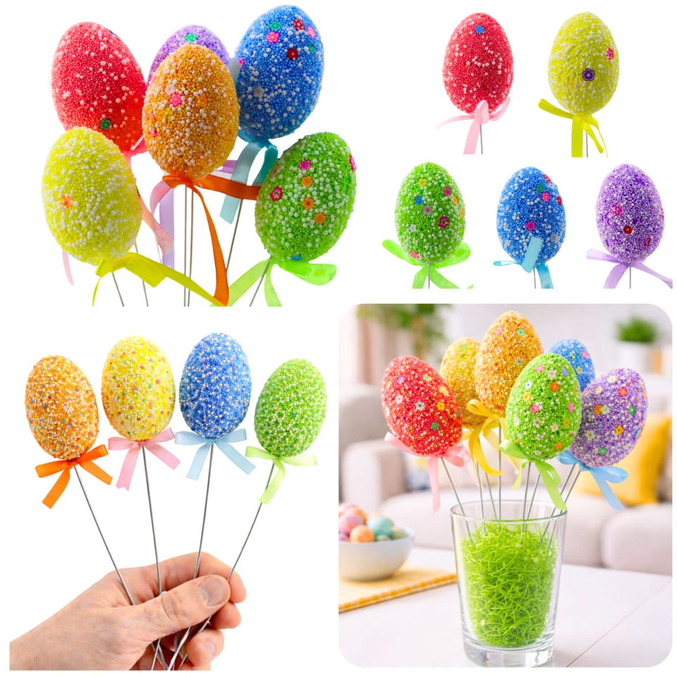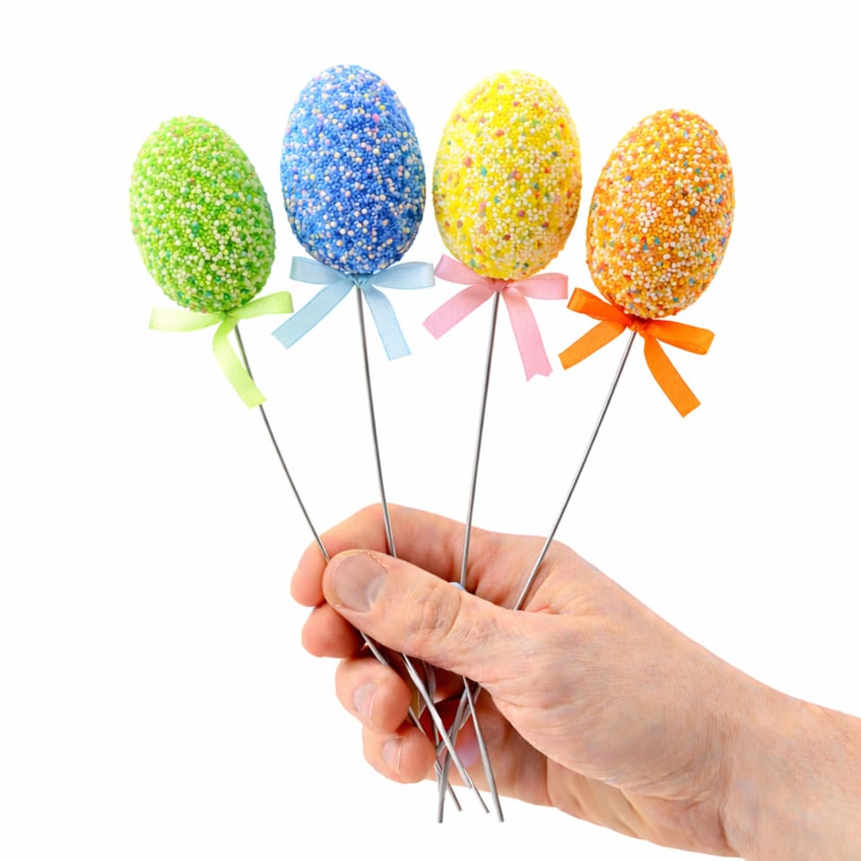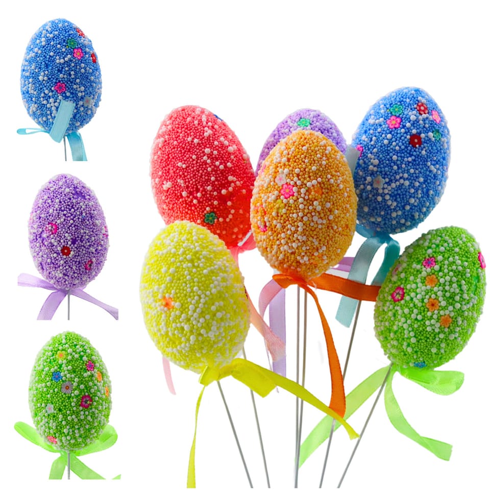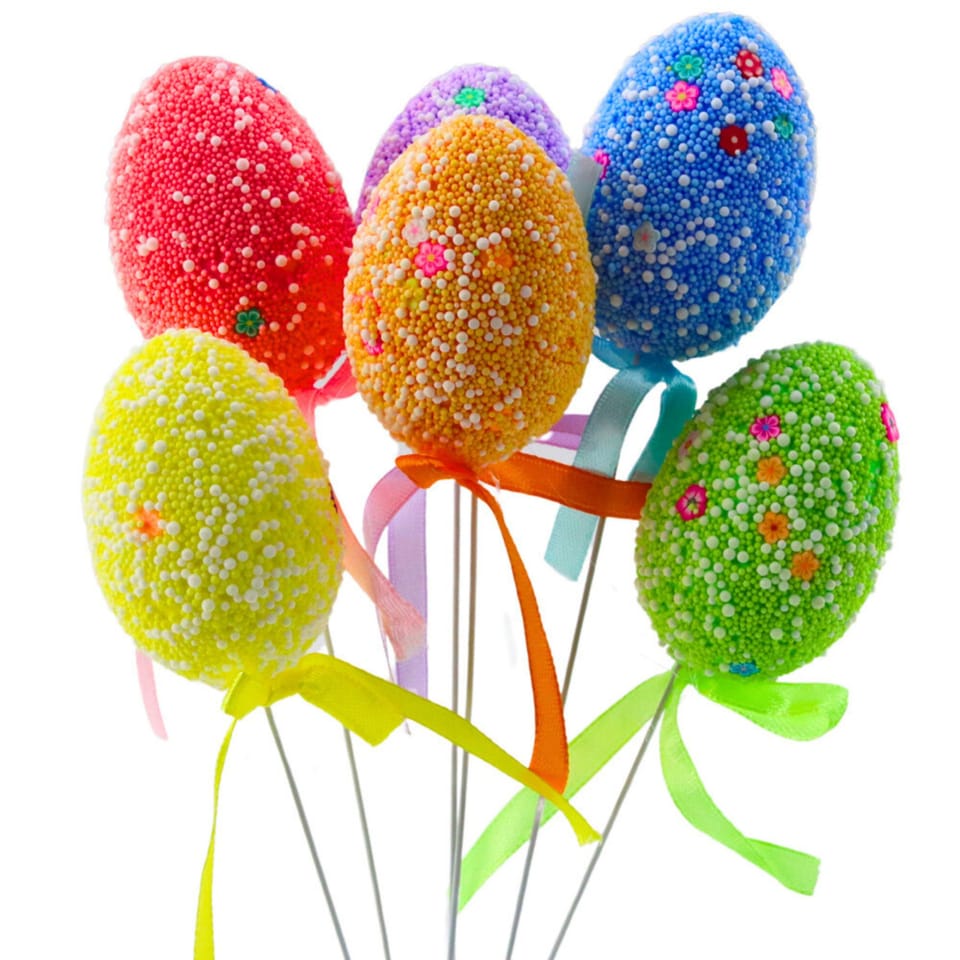 JAJKA WIELKANOCNE NA PIKU DRUCIKU KOLOROWE Z BIAŁYMI KULECZKAMI I WZORKAMI 6SZT