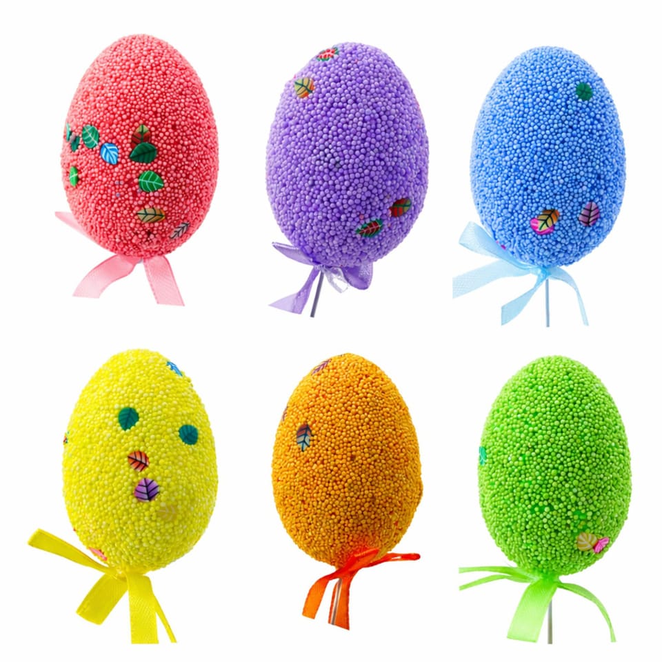 - Każde jajko ozdobione styropianowymi kuleczkami i listkami