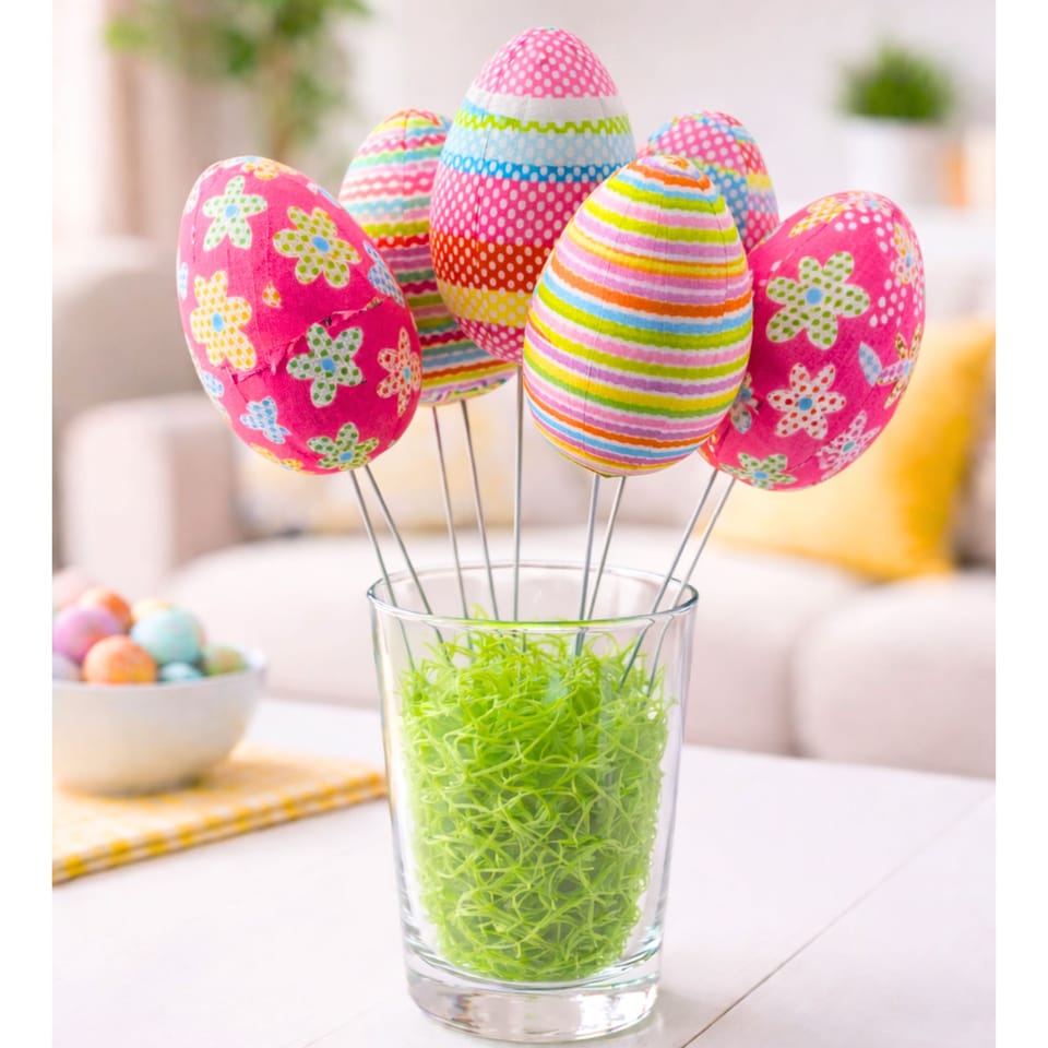 Dekoracyjne jajka wielkanocne na druciku to doskonały sposób na stworzenie wyjątkowej, świątecznej atmosfery. Zestaw zawiera 2 jajka w kropeczki, 2 w paski i 2 w kwiaty, co pozwala na stworzenie różnorodnej i efektownej kompozycji, doskonale komponującej się z wielkanocnymi dekoracjami. Pastelowe kolory, takie jak, wprowadzają do wnętrza ciepło, świeżość i radość, podkreślając wiosenny charakter Świąt Wielkanocnych.