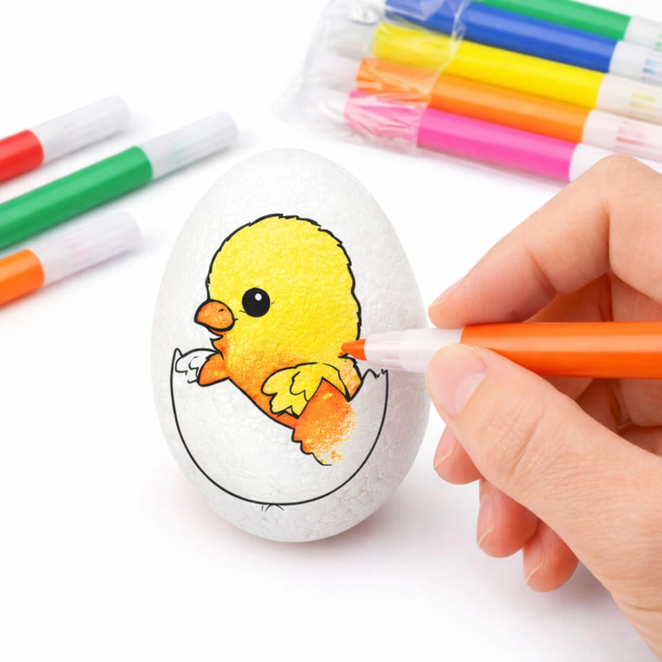 Ten zestaw jajek styropianowych to doskonały wybór do malowania dla dzieci. Jajka mają gładką powierzchnię, gotową do malowania, dekorowania, podpisywania lub po prostu do tworzenia tradycyjnych pisanek. Zestaw zawiera 6 jajek styropianowych ze wzorem kurczaka w jajku oraz flamastry w różnych kolorach, co sprawia, że jest idealny do zabawy w domu, szkole lub przedszkolu.