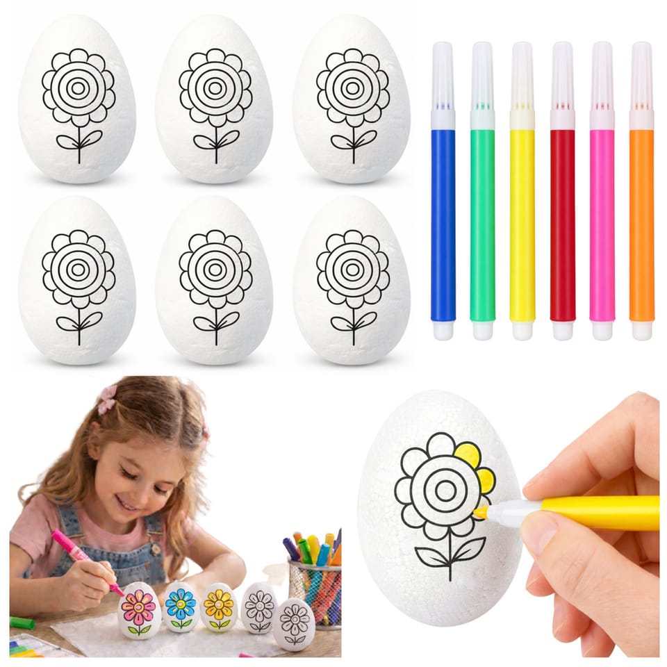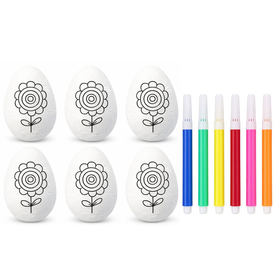 Ten zestaw jajek styropianowych to doskonały wybór do malowania dla dzieci. Jajka mają gładką powierzchnię, gotową do malowania, dekorowania, podpisywania lub po prostu do tworzenia tradycyjnych pisanek. Zestaw zawiera 6 jajek styropianowych ze wzorem kwiatka oraz flamastry w różnych kolorach, co sprawia, że jest idealny do zabawy w domuszkole lub przedszkolu.