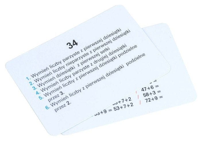 Gra zawiera:- dwustronną planszę,- 45 liczmanów (cyfry i znaki), - 55 kart z działaniami,- 4 pionki,- kostkę do gry,- instrukcję, - ściągawkę.
