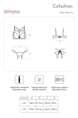 Bardzo uwodzicielski komplet bielizny z dekoracyjnej, w misterny wzór koronki, w kolorze głębokiej czerni. Miękki biustonosz na cienkich, regulowanych ramiączkach, ozdobiony siateczką pasków i małą, biżuteryjną zawieszką. Stringi o orginalnym kroju to połączenie cienkich pasków z koronką, z tyłu satynowa kokardka.