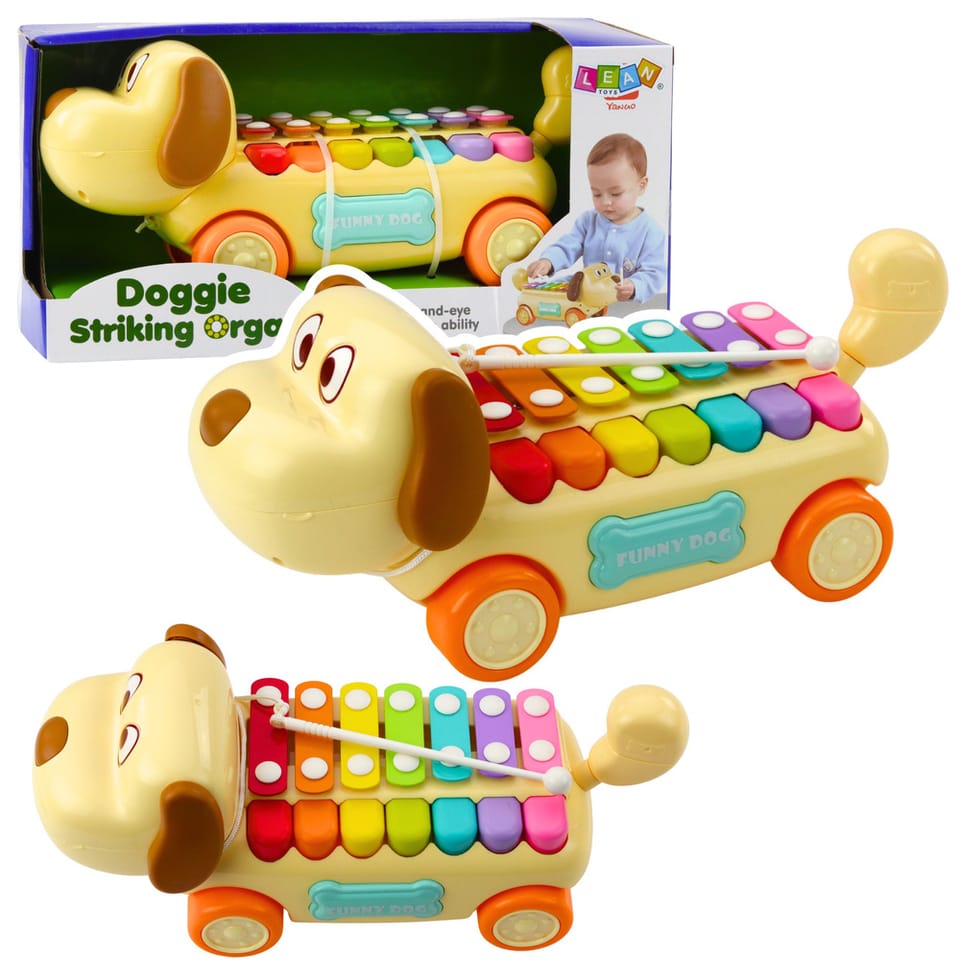 Jeżdżący piesek z kolorowymi cymbałkami to urocza i funkcjonalna zabawka muzyczna, która łączy w sobie elementy edukacyjne, ruchowe i sensoryczne. Zabawka zachęca dzieci do aktywnej zabawy – może być ciągnięta jak klasyczny piesek na sznurku, a jednocześnie umożliwia granie prostych melodii na zamontowanych na grzbiecie cymbałkach. Piesek posiada ruchome uszy i ogonek, które poruszają się w trakcie jazdy, dodając całej zabawie naturalności i radości.