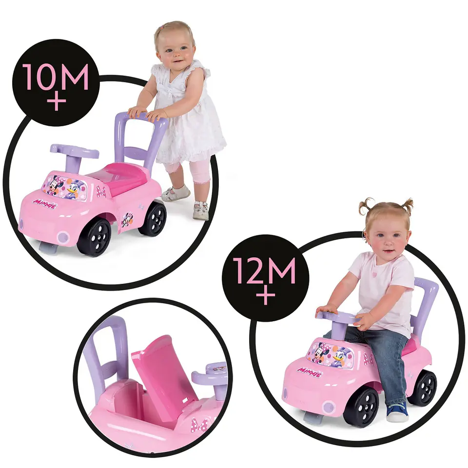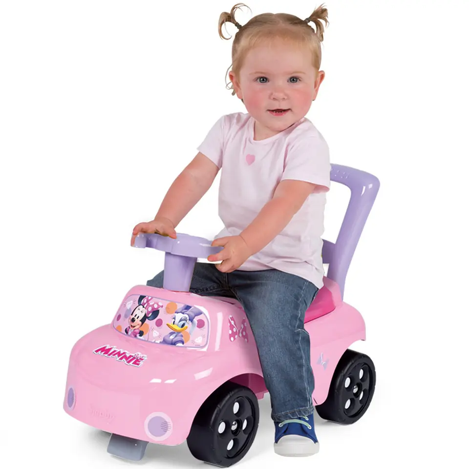 Jeździk z kierownicą, wygodnym siedzeniem ze schowkiem na drobiazgi, z oparciem - rączką do prowadzenia przez dziecko, z wypustkami uniemożliwiającymi wywrócenie się w przód i tył.