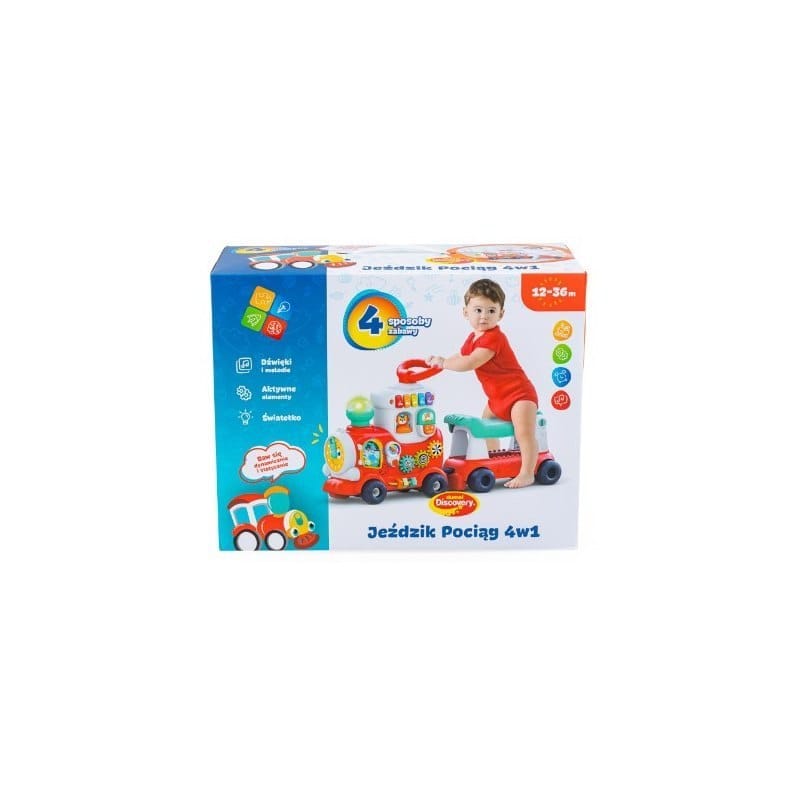 Jeździk Pociąg 4w1 Kolorowy pociąg zabierze malucha na przejażdżkę z atrakcjami! Wyposażony jest w aż 4 różne tryby: siedzenie na wagoniku i odpychanie się nóżkami, odczepienie wagonika i chodzenie za ciuchcią, ciągnięcie wagonika, siedzenie przy ciuchci i zabawa aktywnymi elementami. Na małych odkrywców czeka tu wiele zadań, z pomocą których ćwiczyć mogą sprawność paluszków: tarcza zegara z ruchomą wskazówką, koraliki do przesuwania, książeczka ze stronami do przewracania, kolorowe trybiki do kręcenia i pianinko do tworzenia własnej melodii! Jeździk wyposażony został w światełko, wesołe dźwięki oraz melodie, a także regulację głośności, co pozwala dostosować go do potrzeb malucha. Cechy produktu: - 4 sposoby zabawy: usiądź na wagoniku i odpychaj się nóżkami, odczep wagonik i chodź za ciuchcią, ciągnij wagonik, usiądź przy ciuchci i baw się aktywnymi elementami; - dźwięki i melodie; - aktywne elementy; - światełko; - podnoszone siedzisko (obróć siedzisko, aby przekształcić wagonik w wózeczek do prowadzenia); - odczepiany wagonik; - pianinko; - opuszczane okienko; - zegar z ruchomą wskazówką; - barometr z przekręcanym „kluczykiem"; - ruchome koraliki; - książeczka z obracanymi stronami; - kolorowe trybiki; - regulacja głośności; Baterie: 3 x AAA (baterie niezawarte w zestawie) Wiek: 12-36m