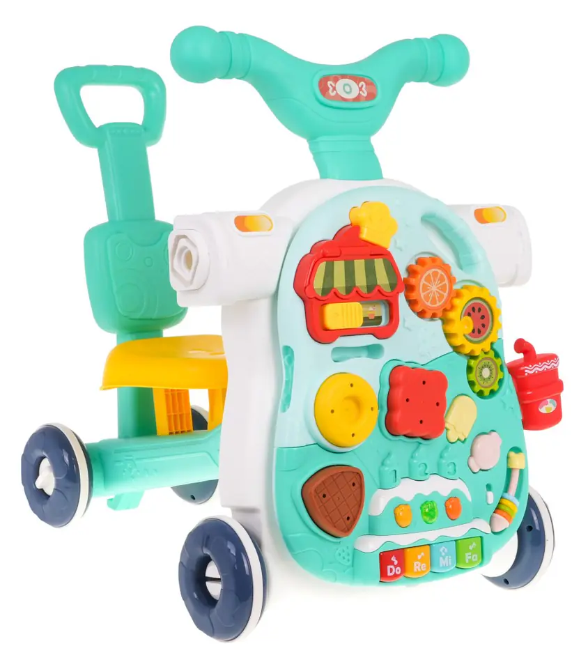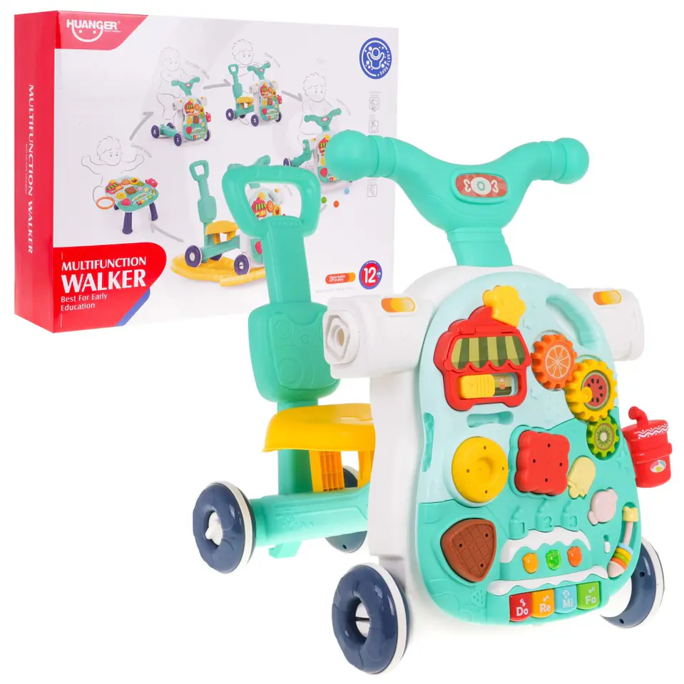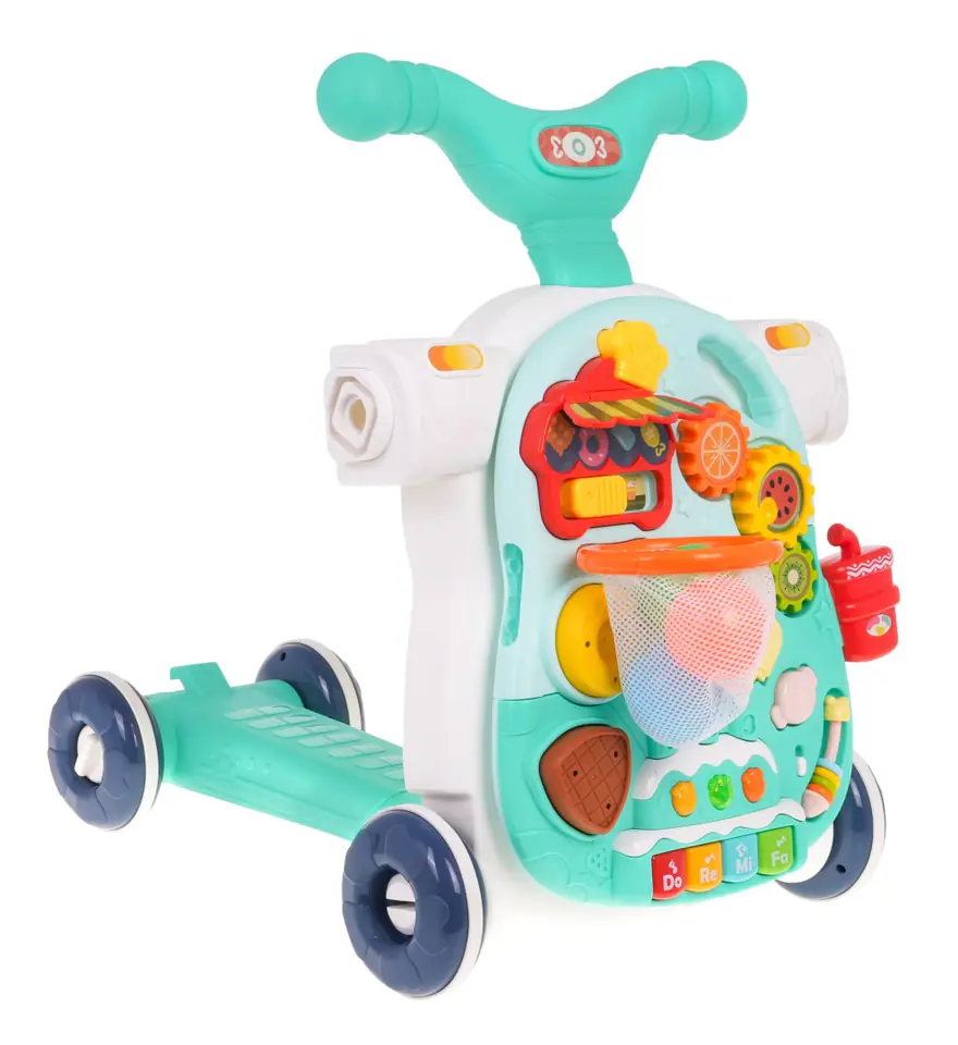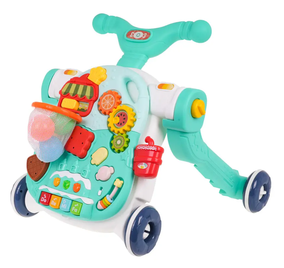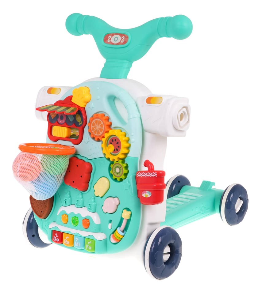 Interaktywny, wielofunkcyjny zestaw 5 w 1 z efektami dźwięku i światła to zabawka dla dzieci już od 12 go- miesiąca życia. Wykonany został z bezpiecznego dla dziecka tworzywa sztucznego, różnorodność kolorów przyciąga wzrok maluszka i zachęca do zabawy. Z zestawu można utworzyć pięć różnych zabawek: chodzik, jeździk, bujaczek, deskorolkę lub stolik multifunkcyjny. Ten zestaw zachęci maluszka do siadania, stawania i robienia pierwszych kroków. Wielofunkcyjny zestaw będzie wartościowy dla dzieci na różnym etapie rozwoju. Zabawka zasilana jest bateriami typu 3 x AA 1,5V, baterii brak w zestawie. Tryby zabawki: - tryb chodzika, - tryb deskorolki, - tryb jeździka, - tryb stolika multifunkcyjnego. - tryb bujaczka. Najważniejsze funkcje zestawu: - możliwość ułożenia z zestawu pięć różnych zabawek, - możliwość obciążenia zabawki (zbiornik na wodę z tyłu), - blokada kół, - kontrola prędkości (opona tego chodzika jest pokryta antypoślizgowym gumowym pierścieniem, który może zwiększyć tarcie o podłoże i zmienić zdolność przyspieszania), - stabilna konstrukcja, - regulacja głośności, - funkcje dźwiękowe i świetlne. Specyfikacja panel multifunkcyjny - efekty świetlne - migające światełko nad organkami, - efekty dźwiękowe - organki: Do, Re, Mi, Fa oraz dwa przyciski nad organkami uruchamiające melodie, - po boku panelu umiejscowiono atrapę kubeczka z rurką, a w środku znajdują się piłeczki, które wydają odgłos grzechotania (dziecko nie ma dostępu do piłeczek), - górny lewy róg panelu sklepik z podnoszonym dachem oraz przekładanką, niżej kosz na piłeczki (3 piłeczki w zestawie), - prawa górna strona panelu - ruchome koła zębate, - środkowa część panelu - wyjmowane atrapy ciasteczek, dziecko musi dopasować kształty, - dolny prawy róg panelu to regulacja głośności i przekładanka z koralikami. | |