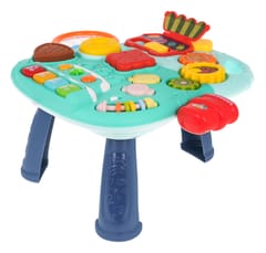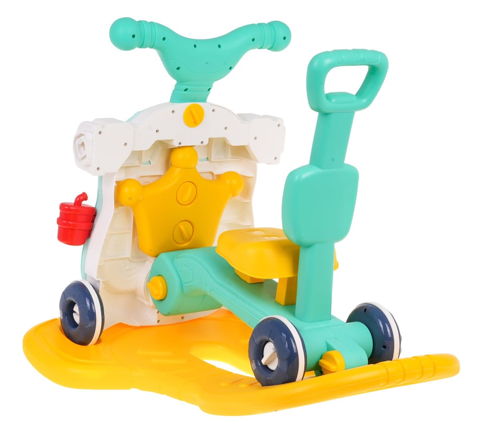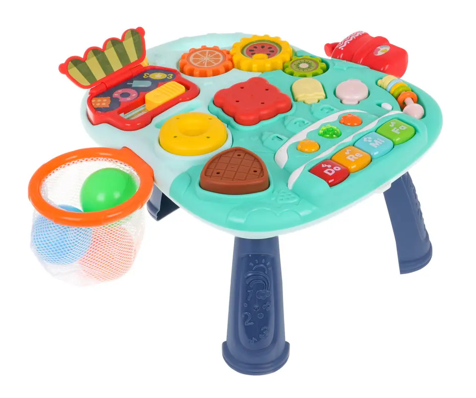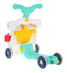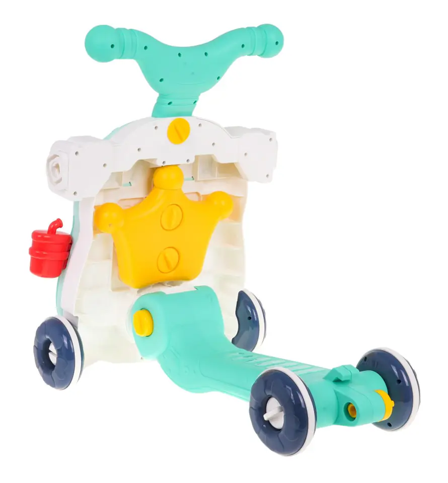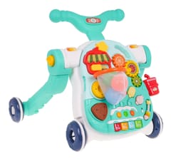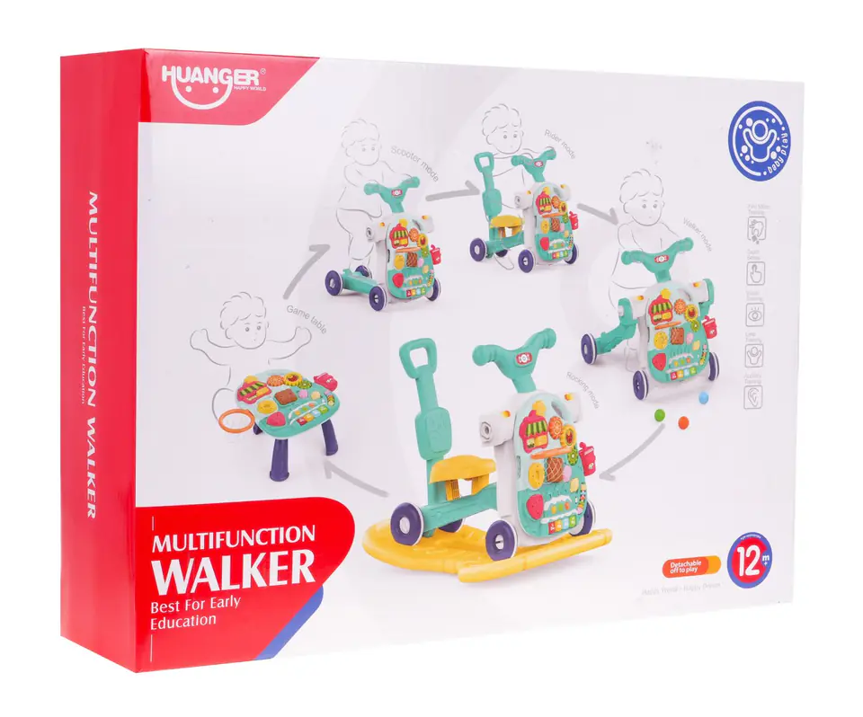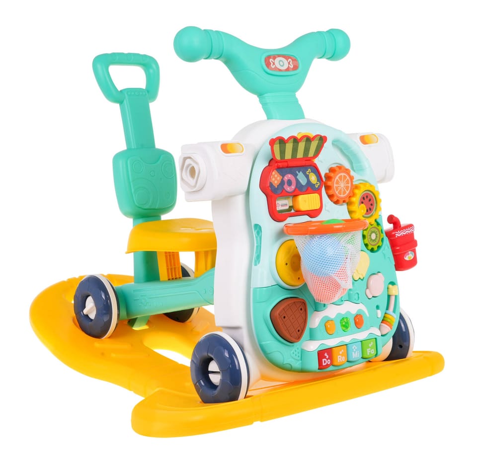 Interaktywny, wielofunkcyjny zestaw 5 w 1 z efektami dźwięku i światła to zabawka dla dzieci już od 12 go- miesiąca życia. Wykonany został z bezpiecznego dla dziecka tworzywa sztucznego, różnorodność kolorów przyciąga wzrok maluszka i zachęca do zabawy. Z zestawu można utworzyć pięć różnych zabawek: chodzik, jeździk, bujaczek, deskorolkę lub stolik multifunkcyjny. Ten zestaw zachęci maluszka do siadania, stawania i robienia pierwszych kroków. Wielofunkcyjny zestaw będzie wartościowy dla dzieci na różnym etapie rozwoju. Zabawka zasilana jest bateriami typu 3 x AA 1,5V, baterii brak w zestawie. Tryby zabawki: - tryb chodzika, - tryb deskorolki, - tryb jeździka, - tryb stolika multifunkcyjnego. - tryb bujaczka. Najważniejsze funkcje zestawu: - możliwość ułożenia z zestawu pięć różnych zabawek, - możliwość obciążenia zabawki (zbiornik na wodę z tyłu), - blokada kół, - kontrola prędkości (opona tego chodzika jest pokryta antypoślizgowym gumowym pierścieniem, który może zwiększyć tarcie o podłoże i zmienić zdolność przyspieszania), - stabilna konstrukcja, - regulacja głośności, - funkcje dźwiękowe i świetlne. Specyfikacja panel multifunkcyjny - efekty świetlne - migające światełko nad organkami, - efekty dźwiękowe - organki: Do, Re, Mi, Fa oraz dwa przyciski nad organkami uruchamiające melodie, - po boku panelu umiejscowiono atrapę kubeczka z rurką, a w środku znajdują się piłeczki, które wydają odgłos grzechotania (dziecko nie ma dostępu do piłeczek), - górny lewy róg panelu sklepik z podnoszonym dachem oraz przekładanką, niżej kosz na piłeczki (3 piłeczki w zestawie), - prawa górna strona panelu - ruchome koła zębate, - środkowa część panelu - wyjmowane atrapy ciasteczek, dziecko musi dopasować kształty, - dolny prawy róg panelu to regulacja głośności i przekładanka z koralikami. | |