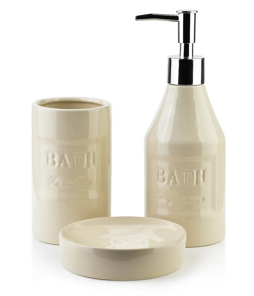 Komplet łazienkowy z kolekcji JOFF marki BATHLAB by MONDEX. Ceramiczny 3 częściowy komplet w odcieniach beżu w wytłocoznym napisem BATH.
