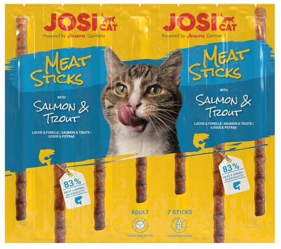 Josera JosiCat Meat Sticks Salmon & TroutJosiCat Meat Sticks z łososiem i pstrągiemDla naszych ukochanych kotów: delikatne miękkie gryzaki z łososiem i pstrągiemNasze przysmaki JosiCat Meat Sticks z łososiem i pstrągiem są uwielbiane przez koty, dlatego sprawdzą się idealnie jako nagroda za słodkie mruczenie, do rozpieszczania, albo jako mała przekąska.Te mięsne pałeczki dla dorosłych kotów mają nie tylko wyjątkowo pyszny smak, ale także odpowiednio apetyczny zapach. Miauuu!Kabanosy można bardzo łatwo porcjować, dlatego są idealną przekąską-nagrodą na każdy dzień.Praktyczne opakowanie zawiera 7 pojedynczo zapakowanych przysmaków JosiCat, dzięki czemu jeszcze łatwiej je podzielić.Karma uzupełniająca dla dorosłych kotów.