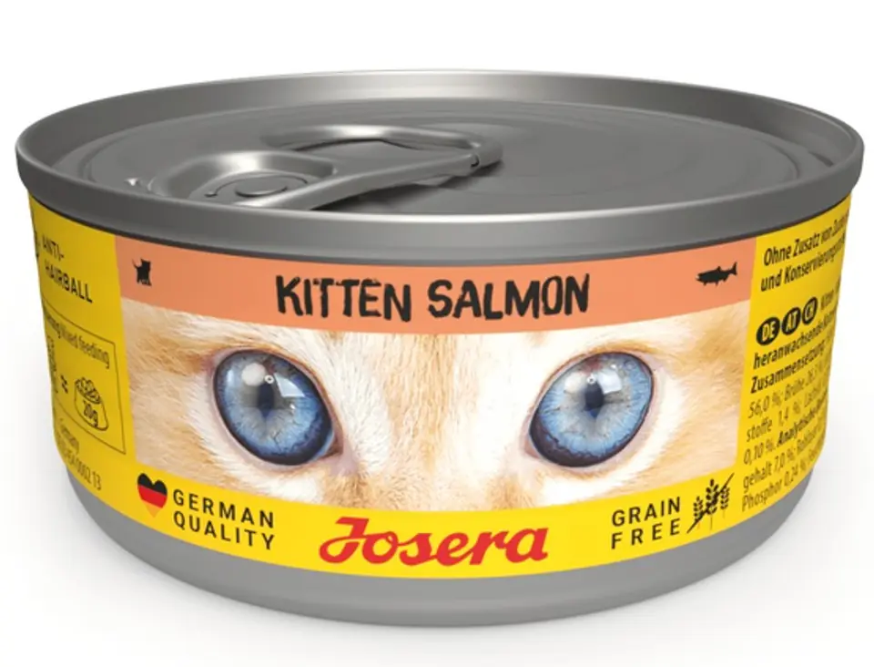 Josera Kitten SalmonPyszna karma w puszce z łososiem dla czworonożnych smakoszyKocięta też mają już swój charakter! Ulubione jedzenie może zmieniać się każdego dnia. Ale nie martw się, bo nasza mokra karma Josera Kitten Salmon świetnie Cię na to przygotuje. Nowy asortyment mokrej karmy dla małych kociąt wyróżnia się bowiem doskonałym smakiem i dużą różnorodnością.70% łososia i kurczaka oraz pyszny bulion nie tylko przypadną do gustu kociętom – bulion może również w smaczny sposób zachęcać młode czworonogi do picia. Nasza bezzbożowa receptura ma jednak jeszcze więcej do zaoferowania: pasternak jest źródłem warzyw, olej z łososia dostarcza niezbędnych kwasów tłuszczowych omega-3, a błonnik roślinny może przeciwdziałać zakłaczeniu.
