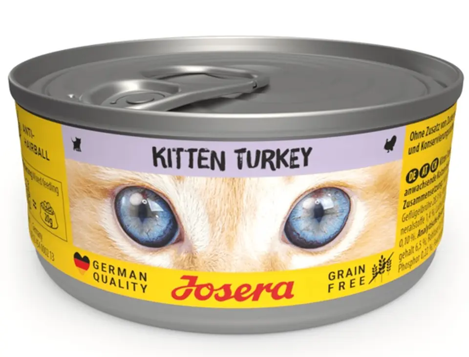 Josera Kitten TurkeyPyszna karma w puszce z indykiem dla czworonożnych smakoszyNawet najmniejszy kotek zareaguje głośnym, głodnym miauknięciem, gdy dostanie naszą mokrą karmę Josera Kitten Turkey! Nic dziwnego, bo ta soczysta karma zawiera 70% indyka i kurczaka oraz pyszny drobiowy bulion. Bezzbożowa receptura dostarcza niezbędne kwasy tłuszczowe omega-3 dzięki olejowi z łososia, a za sprawą specjalnego dietetycznego błonnika roślinnego może nawet przeciwdziałać zakłaczeniu.Małe charakterki potrafią być naprawdę uparte – ale przynajmniej masz już dla nich idealne menu. Miau!