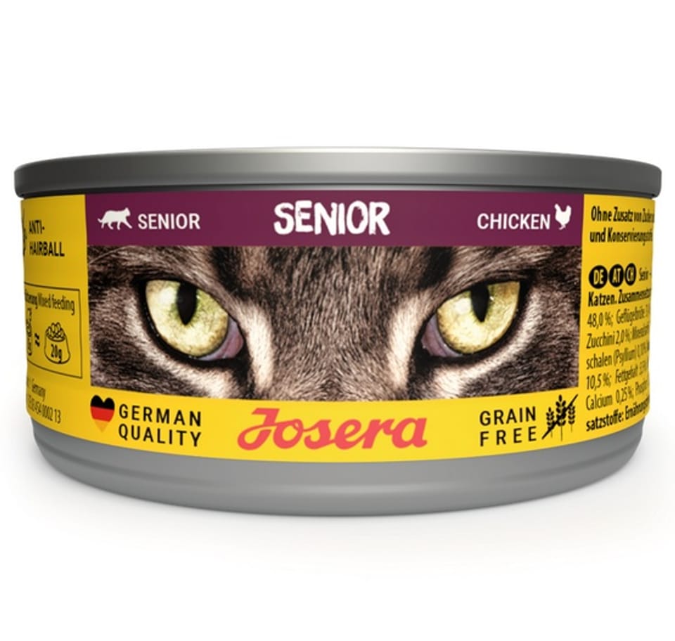 JOSERA Senior dla kotaCo mają ze sobą wspólnego koty i dobre wino? Są coraz lepsze z wiekiem! Dzięki naszej mokrej karmie Josera Senior starsze mruczki otrzymają niezbędne składniki i urozmaiconą dietę. Bezzbożową recepturę wzbogacono o soczystego kurczaka. Olej z łososia dostarcza niezbędne kwasy tłuszczowe omega-3. Aby zapewnić naszym dojrzałym czworonogom optymalną dietę, mokra karma w puszce zawiera L-karnitynę. Opóźnia ona związaną z wiekiem redukcję masy mięśniowej. Dodatkowo cenne przeciwutleniacze zapobiegają starzeniu się komórek.Starsze koty często niechętnie zaglądają do miski z wodą – dlatego mokra karma Josera Senior znakomicie sprawdza się także jako codzienne źródło płynów.Pełnoporcjowa karma dla dorosłych kotów.Skład:48,0% kurczak (serce, mięso, wątroba, szyja); 31,4% bulion drobiowy; 17,0% indyk (żołądek, wątroba); 2,0% cukinia; 1,3% minerały; 0,2% olej z łososia; 0,1% łuski nasion babki płesznik (psyllium)Dodatki:Dodatki dietetyczne w 1 kg: Witamina D3 I.E./kg 200, Witamina E mg/kg 51, Tauryna mg/kg 1.500, L-karnityna mg/kg 200, Cynk (jednowodny siarczan cynku) mg/kg 15,0, Mangan (siarczan manganawy, monohydrat) mg/kg 3,00, Miedź (glicynowy chelat miedzi(II), hydrat (w postaci stałej)) mg/kg 1,50, Jod (bezwodny jodan wapnia) mg/kg 0,75Analiza: