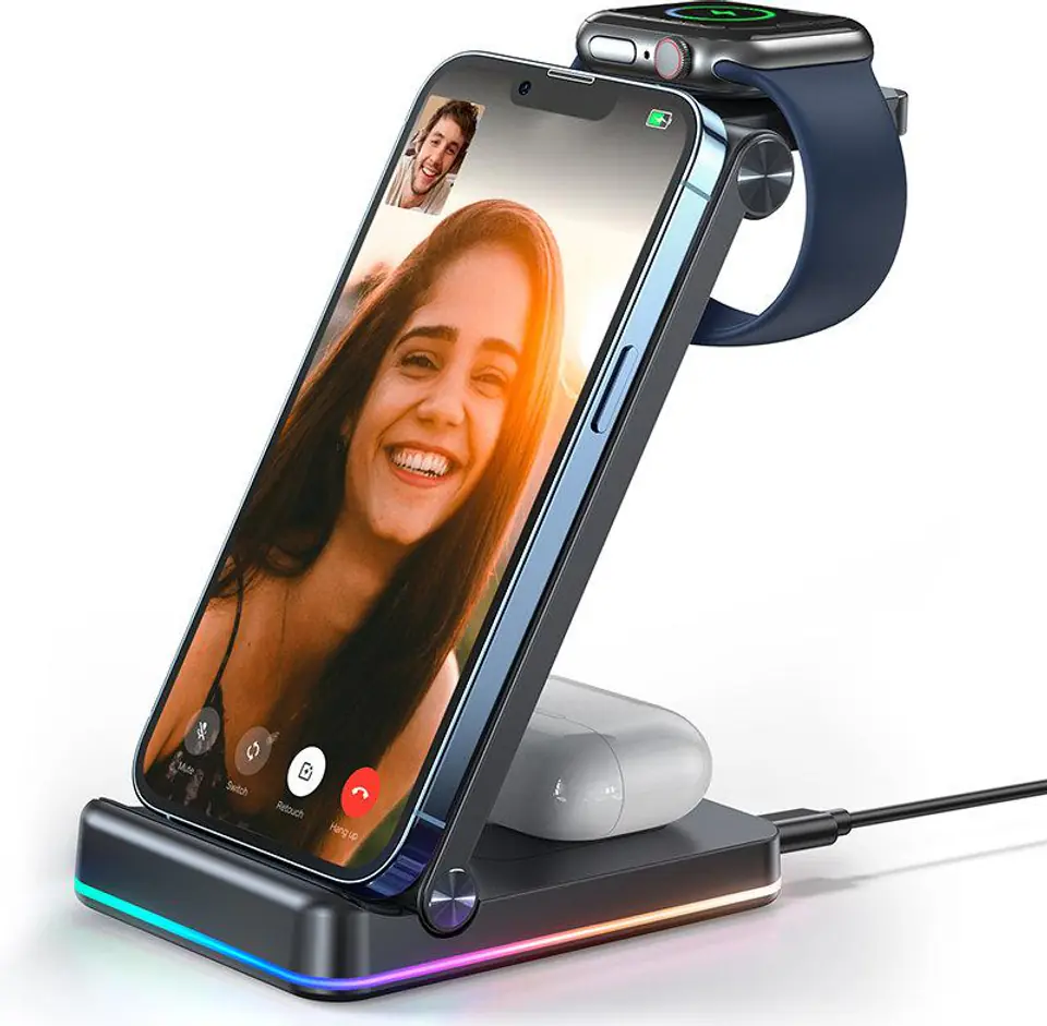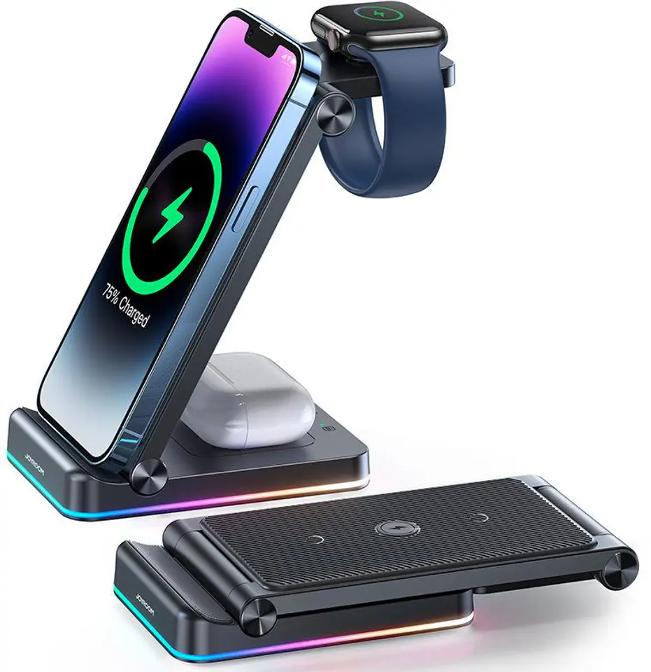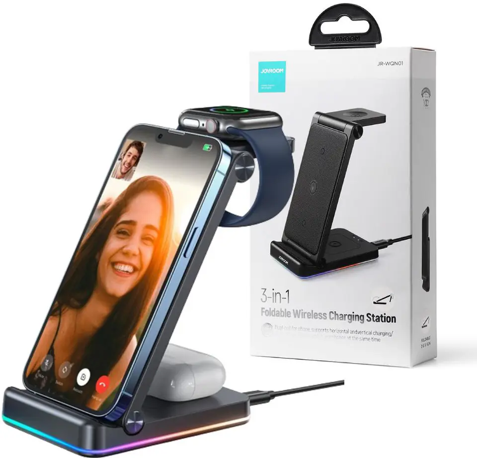 Joyroom 3w1 ładowarka indukcyjna do sprzętu marki Apple - iPhone, Apple Watch, Airpods (do 15W) podstawka stojak czarna (JR-WQN01)