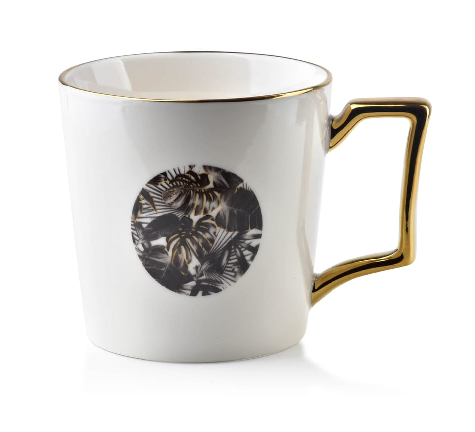 Przepiękny porcelanowy kubek z serii JUNGLE marki AFFEKDESIGN. Złote ucho i złota obwódka nadają elegancji. Zapakowany w jednostkowe pudełko. Nie należy stosować w zmywarce i mikrofali. pojemność: 400ml wymiar: 13.5x9.5xh10cm