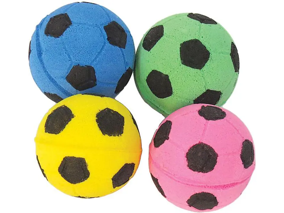 Piłki futbol, zestaw 4 szt. W skład zestawu wchodzą 4 piłeczki wykonane z miękkiej gąbki. Miękkie piłki dla kotów wykonane są z nietoksycznej gąbki. Zabawki z miękkiego tworzywa ze względu na plastyczność nadają się w szczególności dla kociąt, ale świetnie sprawdzą się również dla dorosłych osobników. Piłeczka jest wytrzymała i odporna na kocie pazurki. Średnica: 4 cm