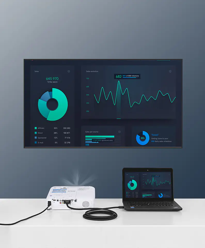 Ciesz się jakością obrazu Full HD 1080p (1920x1200). Podłącz laptop czy PC do telewizora, zewnętrznego monitora czy projektora. Zadbaj o efektywność pracy i rozrywkę w nowym wymiarze. Korzystaj z jednego z dwóch trybów pracy: mirror (wyświetla ten sam obraz na dwóch ekranach) lub extended (powiększa przestrzeń roboczą bazowego ekranu).