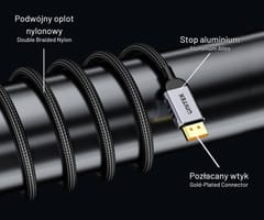 | Wybrane cechy: | Pozłacane złącze zapobiega utlenianiu się styków Nylonowy oplot - odporny na zagięcia Obsługa HDR10+ Obsługa HDCP 2.2 / 2.3 Odporność na zakłócenia elektromagnetyczne Obsługa do 32 kanałów audio z częstotliwością próbkowania 1536 kHz |