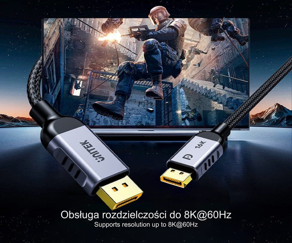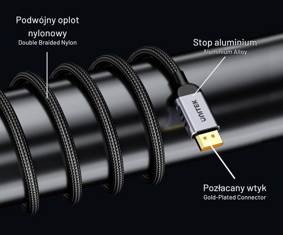 C1626GY01-2M to kabel DisplayPort 2.1 marki UNITEK przeznaczony do gamingu i zastosowań multimedialnych o wysokich wymaganiach. Obsługuje rozdzielczość do 16K przy 60 Hz z DSC, 8K przy 120 Hz, 4K przy 240 Hz i 2K przy 360 Hz, oferując przepustowość do 80 Gb/s. Dynamic HDR, ekranowanie EMI i pozłacane złącza zapewniają stabilny obraz i wysoką trwałość.