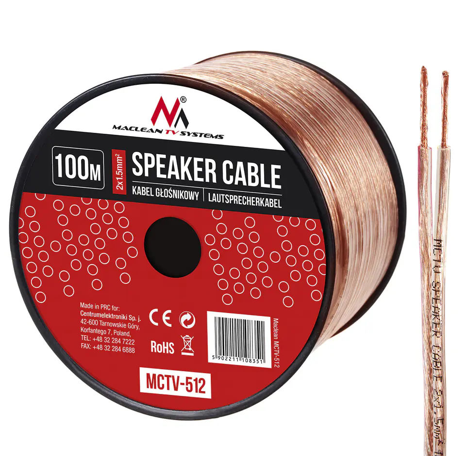 Cechy- Rodzaj przewodu: głośnikowy- Przekazywany sygnał: audio- Wysoka jakość wykonania- CCA OFC- Przezroczysta i elastyczna izolacja- Długość kabla: 100m