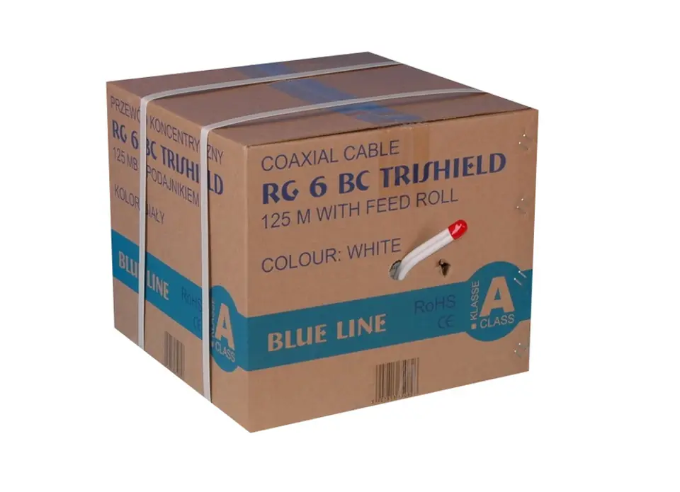 Wysokiej jakości podwójny przewód koncentryczny w kolorze białym z żyłą miedzianą. Kabel 125 mb w kartonie z podajnikiem umożliwiającym łatwe i wygodne rozwijanie przewodu.