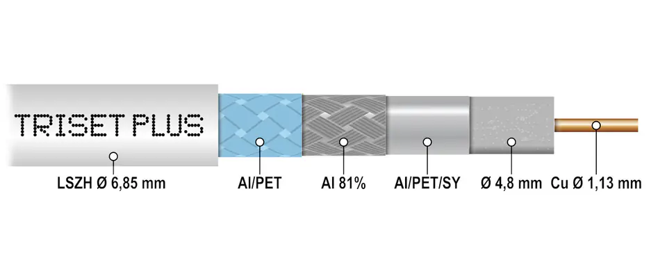 Wysokiej jakości przewód koncentryczny TRISET-PLUS/500 dedykowany zarówno do instalacji indywidualnych jak i zbiorczychKabel wykonany w płaszczu LSZH (LS0H) - izolacja bezhalogenowa, stosowany tam, gdzie potrzebne jest większe bezpieczeństwo na wypadek pożaru (budynki mieszkalne wysokie i wysokościowe, użyteczności publicznej).
