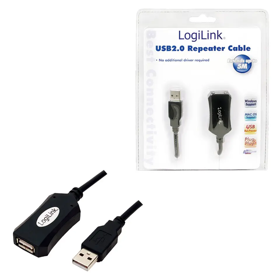 Maksymalna długość przedłużacza zgodna z standardem to 5m. Dzięki zastosowaniu Repeatera marki LogiLink mozna rozszerzyć długość przedłużacza aż do 20m. Istnieje możliwość połączenia maksymalnie 3 repeaterów i przesyłać dane z prędkością 480Mb/s. Dzięki zastosowaniu ekranu urządzenie odporne jest na zakłócenia elektromagnetyczne.Główne cechy:- Wysokiej jakości kabel przedłużacz USB 2.0- Złącze 1: USB A męskie- Złącze 2: USB A żeńskie- Rozszerzenie do 20m- Max. Transmisja danych: 480 Mbps- Podwójnie ekranowany- Zgodny z UL-2725- Typ kabla: AWG 30