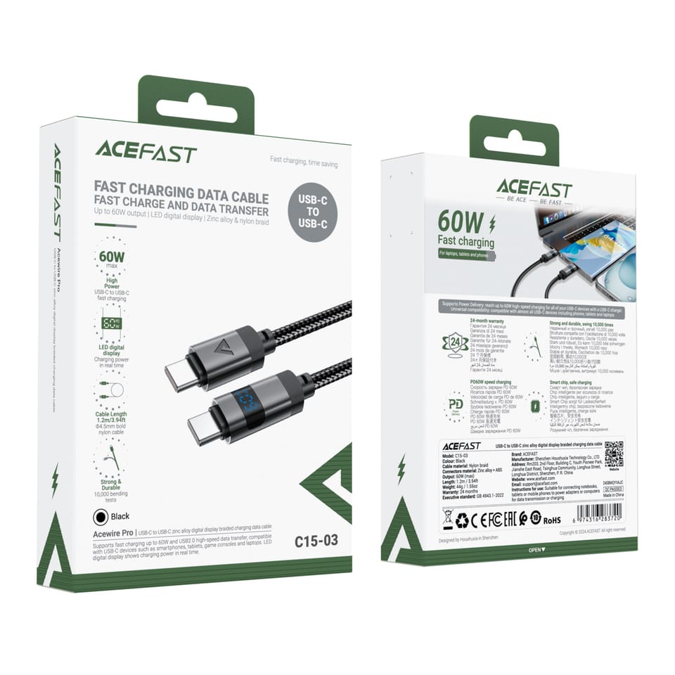 Kod produktu: 1027518Kabel Acefast C15-04 USB-C - USB-C zapewnia szybkie i efektywne ładowanie o mocy do 60W oraz transfer danych z prędkością 480Mb/s. Wyposażony w cyfrowy wyświetlacz LED, informuje o rzeczywistej mocy ładowania w czasie rzeczywistym. Solidna pleciona konstrukcja gwarantuje wytrzymałość i odporność na zginanie oraz uszkodzenia. Certyfikaty CE, RoHS, FCC i EAC potwierdzają bezpieczeństwo użytkowania.Szybkie i efektywne ładowanie do 60WWsparcie dla szybkiego ładowania o mocy do 60W umożliwia ekspresowe zasilanie smartfonów, tabletów i innych urządzeń.Wyświetlacz LED - pełna kontrola mocyDzięki inteligentnemu wyświetlaczowi LED możesz monitorować aktualne parametry ładowania w czasie rzeczywistym.Wytrzymały i elastyczny przewódSolidna pleciona osłona sprawia, że kabel jest odporny na rozciąganie, zginanie i codzienne użytkowanie.Szybki transfer danych do 480Mb/sPrzesyłaj pliki, zdjęcia i filmy w mgnieniu oka dzięki transferowi na poziomie 480Mb/s.Bezpieczeństwo i certyfikatySpełnia rygorystyczne normy bezpieczeństwa dzięki certyfikatom CE, RoHS, FCC i EAC.Najważniejsze cechy: