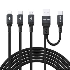 Kod produktu: 1031228Dudao L3W to wszechstronny przewód z podwójnym wejściem USB-A i USB-C oraz trzema wyjściami - Lightning, USB-C i MicroUSB. Dzięki takiemu układowi jednym kablem naładujesz niemal każde urządzenie - od smartfona i tabletu po powerbank czy słuchawki. Obsługuje szybkie ładowanie o mocy do 66 W i transmisję danych do 480 Mb/s. Pleciony nylonowy oplot zwiększa trwałość, a elastyczna konstrukcja zapobiega plątaniu się kabla.Cechy produktu:
