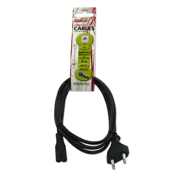Kabel sieciowy 230V zasilacz, CEE7/16 euro radiowy) - C7, 2 m, VDE approved, czarny, Logo, 2-pinowe złącze, EO